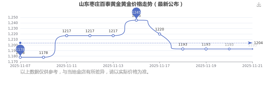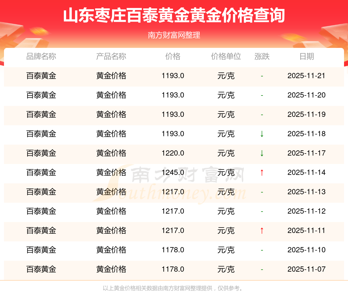 山东枣庄百泰黄金在 2025年11月23日,黄金价格的售卖价格是 1193.0元/克。