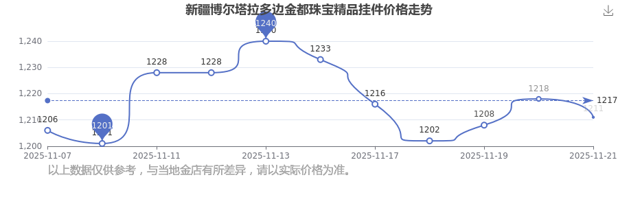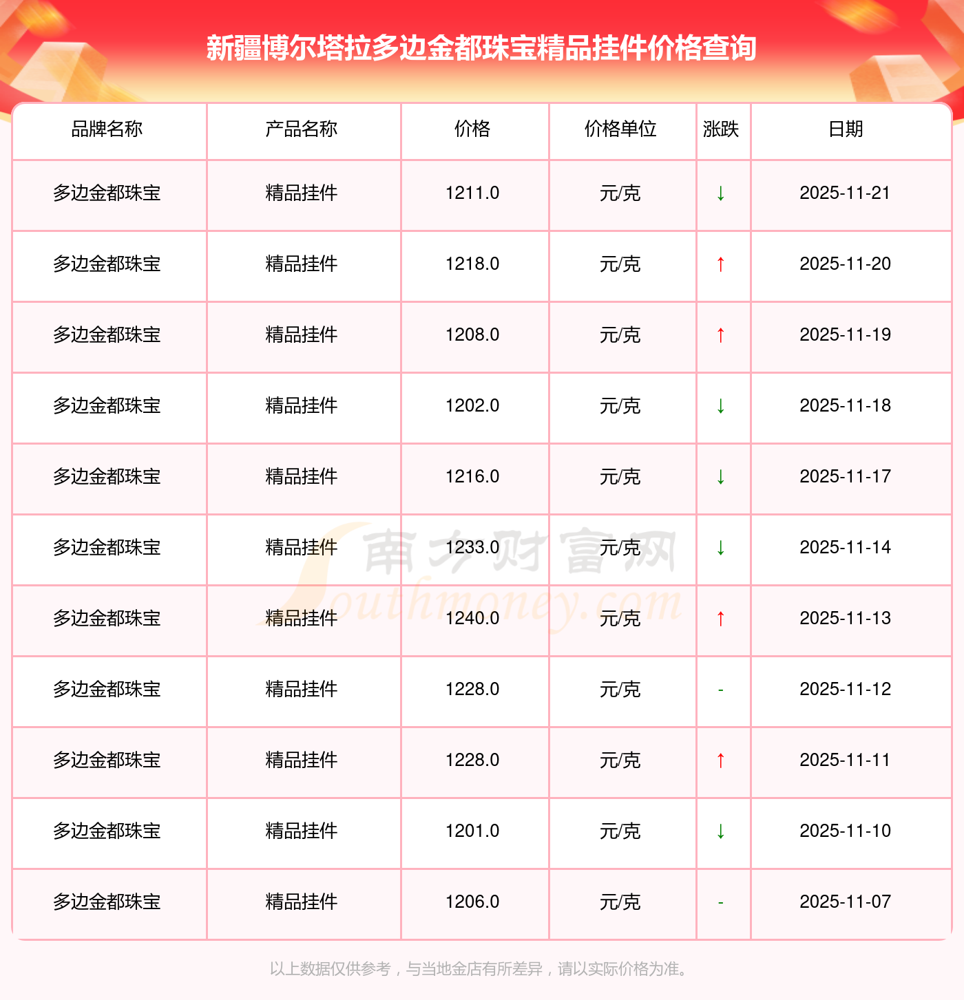 2025年11月23日,今日新疆博尔塔拉多边金都珠宝精品挂件价格:1211.0元/克。