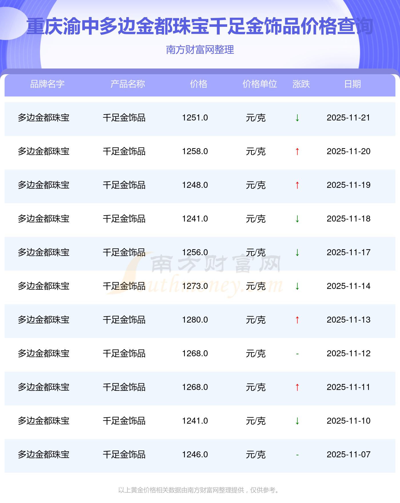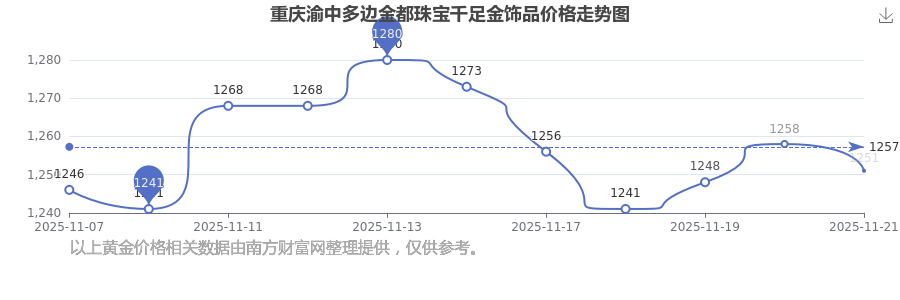 2025年11月23日这一天,重庆渝中多边金都珠宝的千足金饰品以 1251.0元/克的价格售卖。