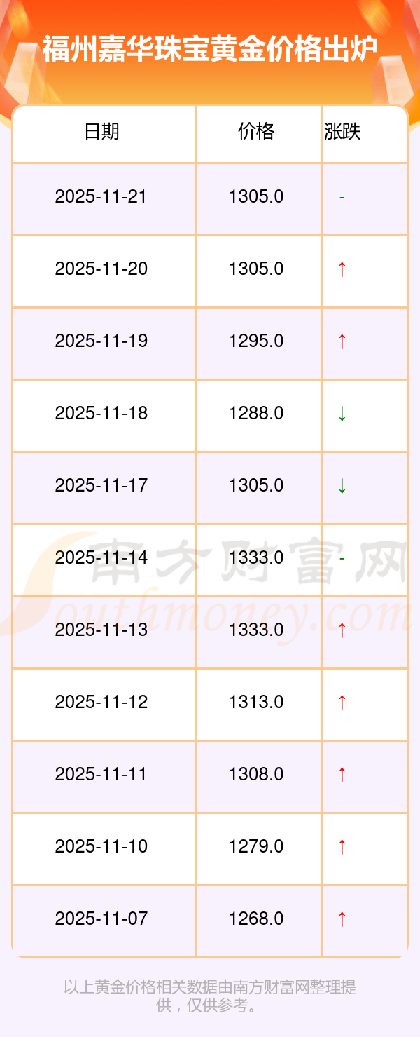 今日(2025年11月23日),福州嘉华珠宝黄金价格的定价为 1305.0元/克。