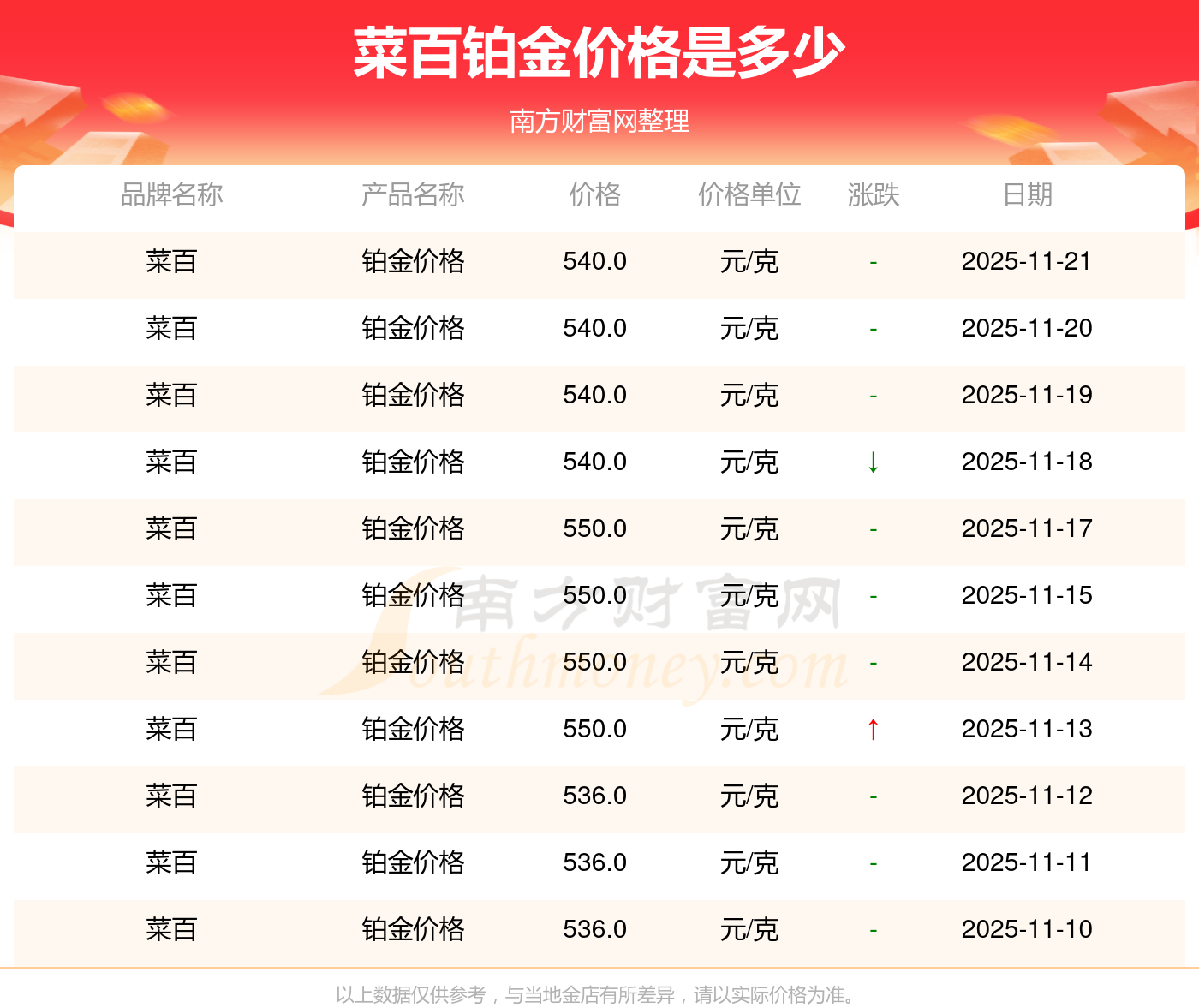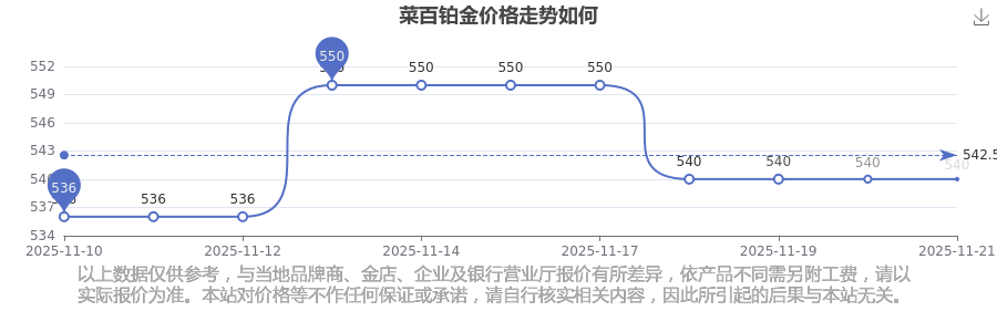 今日菜百 铂金价格的最新定价为540.0元/克。