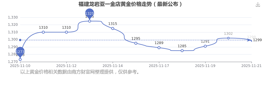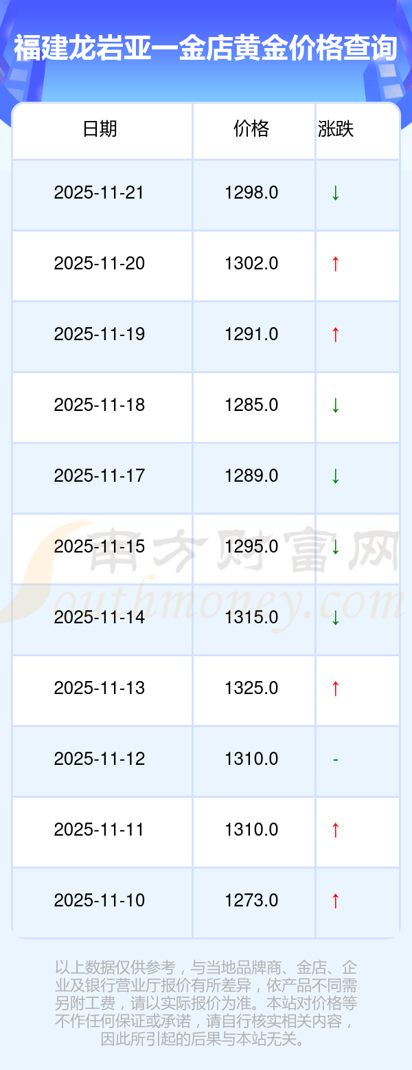 2025年11月23日当天,福建龙岩亚一金店黄金价格的单价是 1298.0元/克。
