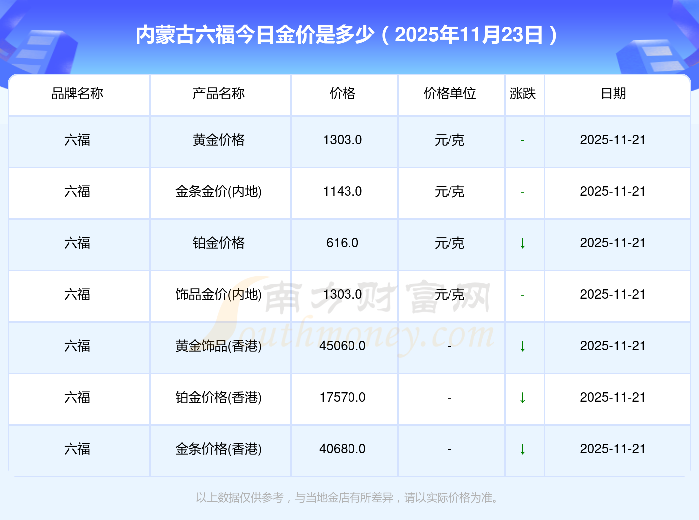 以上数据仅供参考,与当地品牌商、金店、企业及银行营业厅报价有所差异,依产品不同需另附工费,请以实际报价为准。本站对价格等不作任何保证或承诺,请自行核实相关内容,因此所引起的后果与本站无关。