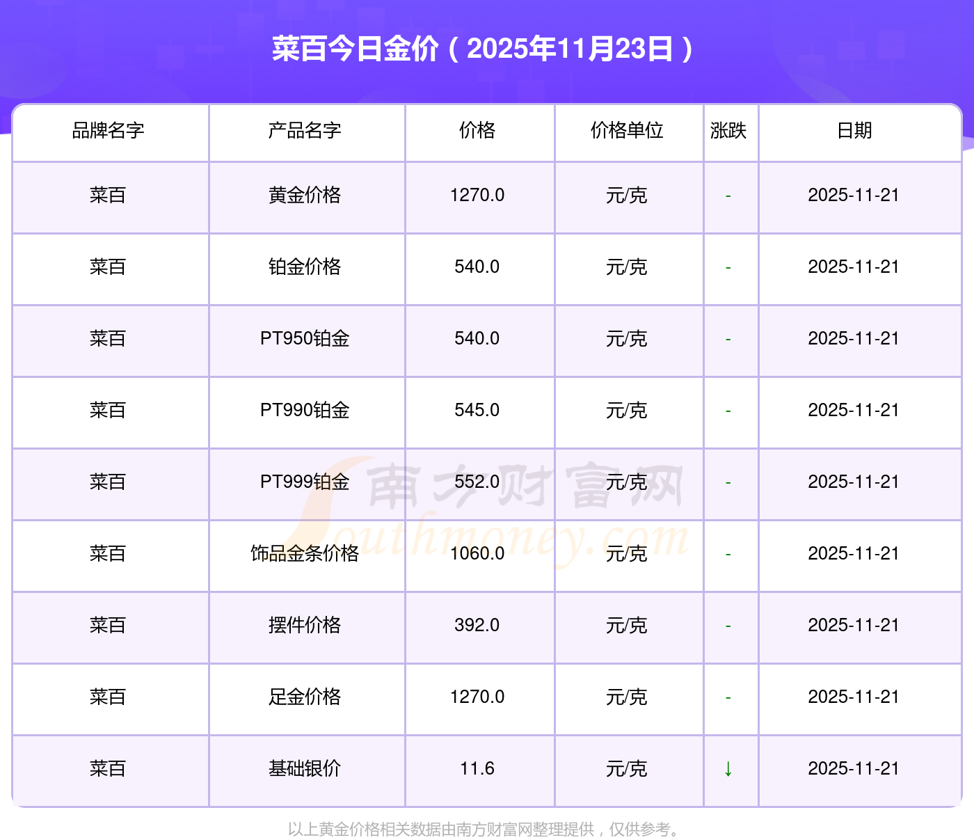 现在菜百黄金价格是多少钱1克_2025年菜百今日金价是多少钱一克,最新菜百查询,2025年11月23日菜百PT950铂金现在每克多少钱?最新菜百PT950铂金报价公布,一起来看看吧!