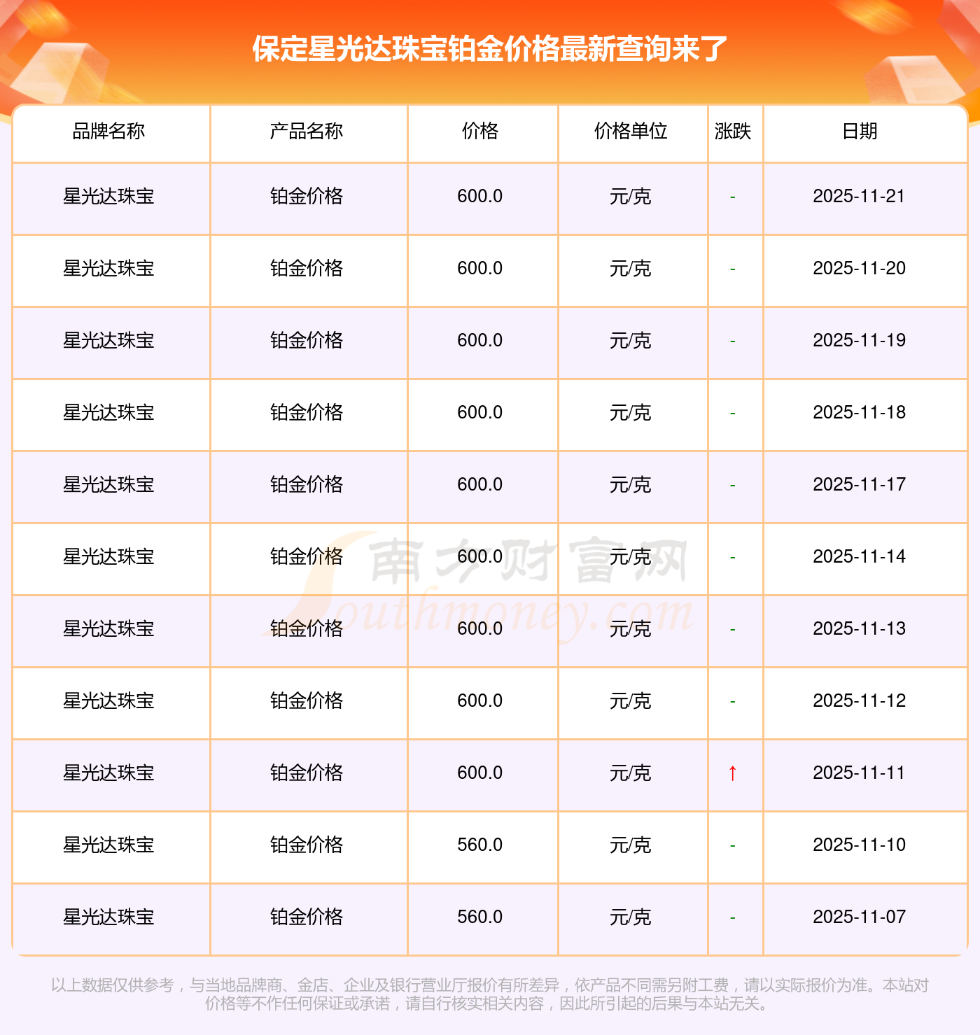 2025年11月23日周大福、周大福、周大福、周大福、周大福、周大福、周大福、老凤祥、老凤祥、老凤祥、周六福等各大金店品牌铂金价格最新价格如下:周大福黄金价格1305.0元/克,周大福铂金价格616.0元/克,周大福饰品金价(内地)1305.0元/克,周大福黄金饰品(香港)45110.0,周大福铂金价格(香港)17570.0,周大福金条价格(香港)40690.0,周大福金条金价(内地)1143.0元/克,老凤祥黄金价格1298.0元/克,老凤祥铂金价格600.0元/克,老凤祥足金价格1298.0元/克,周六福黄金价格1266.0元/克。