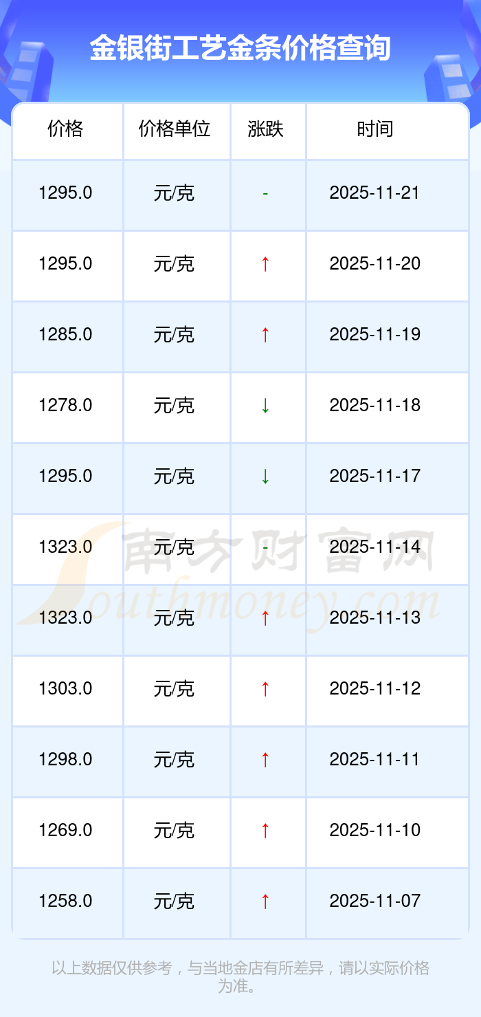 今日金银街 工艺金条的最新定价为1295.0元/克。