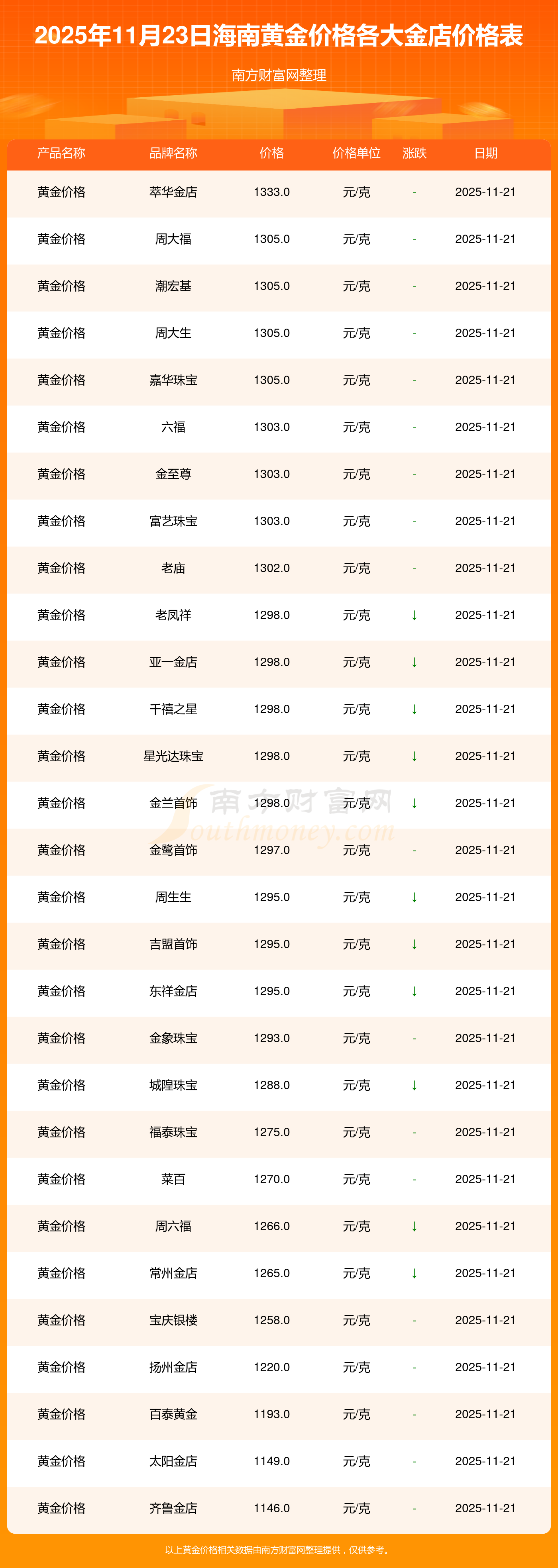 2025年11月23日海南各大金店黄金价格最新价格:周大福1305.0元/克,周大福616.0元/克,周大福1305.0元/克,周大福45110.0,周大福17570.0,周大福40690.0,周大福1143.0元/克,老凤祥1298.0元/克,老凤祥600.0元/克,老凤祥1298.0元/克,周六福1266.0元/克。