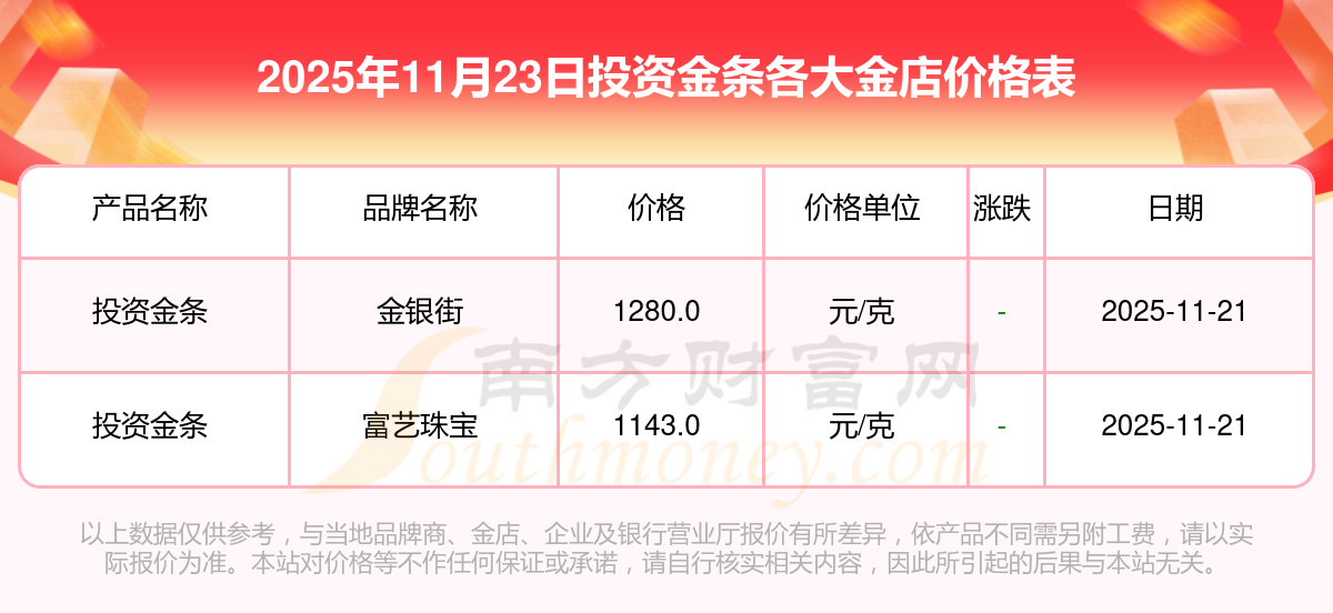 今日投资金条最低的金店是富艺珠宝,报价1143.0元/克,最高的是金银街,报价1280.0元/克。今日投资金条高低差为137元/克。