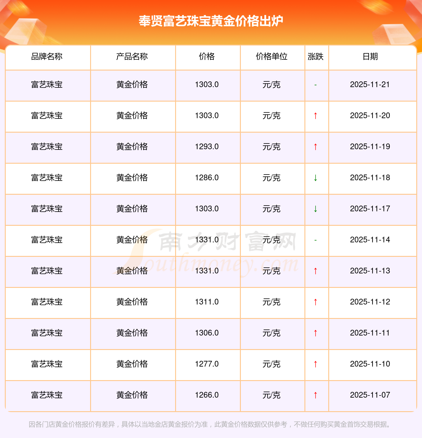 今日奉贤富艺珠宝黄金价格查询,1303.0元/克的黄金价格,是奉贤富艺珠宝在 2025年11月23日给出的。