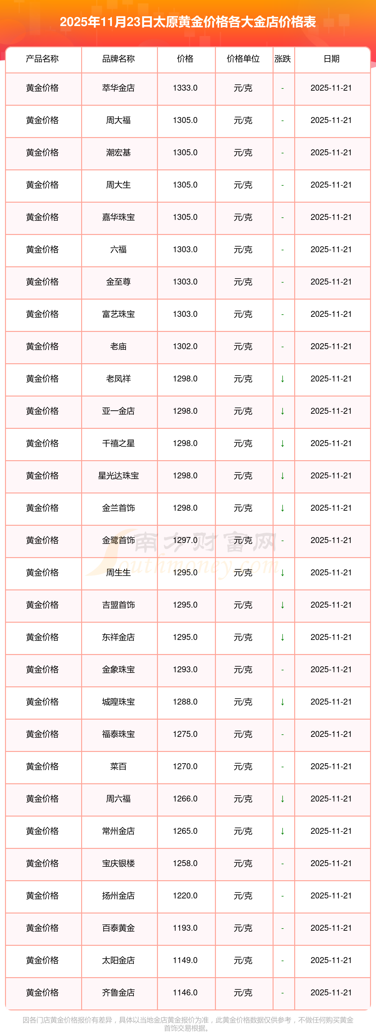 一、 黄金价格走势今日价格行情一览表,太原各金店黄金价格当下购买一克的价格是多少?