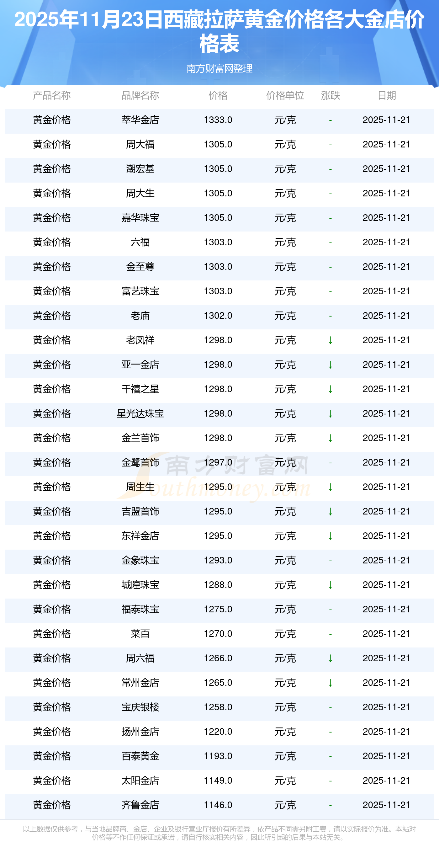 2025年11月23日西藏拉萨周大福、周大福、周大福、周大福、周大福、周大福、周大福、老凤祥、老凤祥、老凤祥、周六福等各大金店品牌黄金价格最新价格行情来了,如下:周大福黄金价格1305.0元/克,周大福铂金价格616.0元/克,周大福饰品金价(内地)1305.0元/克,周大福黄金饰品(香港)45110.0,周大福铂金价格(香港)17570.0,周大福金条价格(香港)40690.0,周大福金条金价(内地)1143.0元/克,老凤祥黄金价格1298.0元/克,老凤祥铂金价格600.0元/克,老凤祥足金价格1298.0元/克,周六福黄金价格1266.0元/克。
