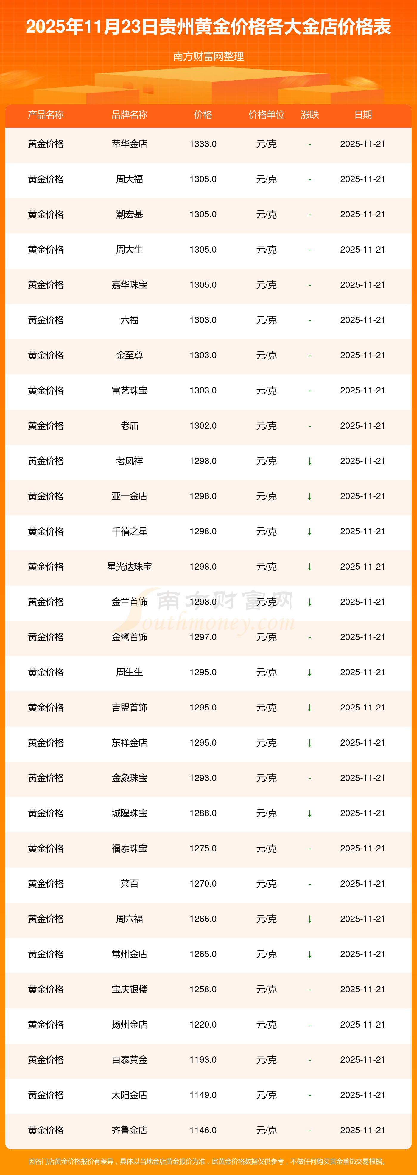 今天是2025年11月23日,贵州周大福、周大福、周大福、周大福、周大福、周大福、周大福、老凤祥、老凤祥、老凤祥、周六福等各大金店品牌黄金价格最新价格行情是这样的:周大福1305.0元/克、周大福616.0元/克、周大福1305.0元/克、周大福45110.0、周大福17570.0、周大福40690.0、周大福1143.0元/克、老凤祥1298.0元/克、老凤祥600.0元/克、老凤祥1298.0元/克、周六福1266.0元/克。