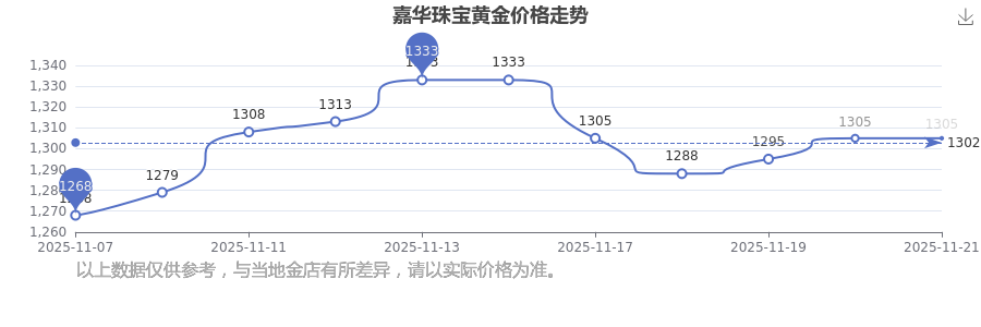 嘉华珠宝 黄金价格在今日的最新价格显示为1305.0元/克。