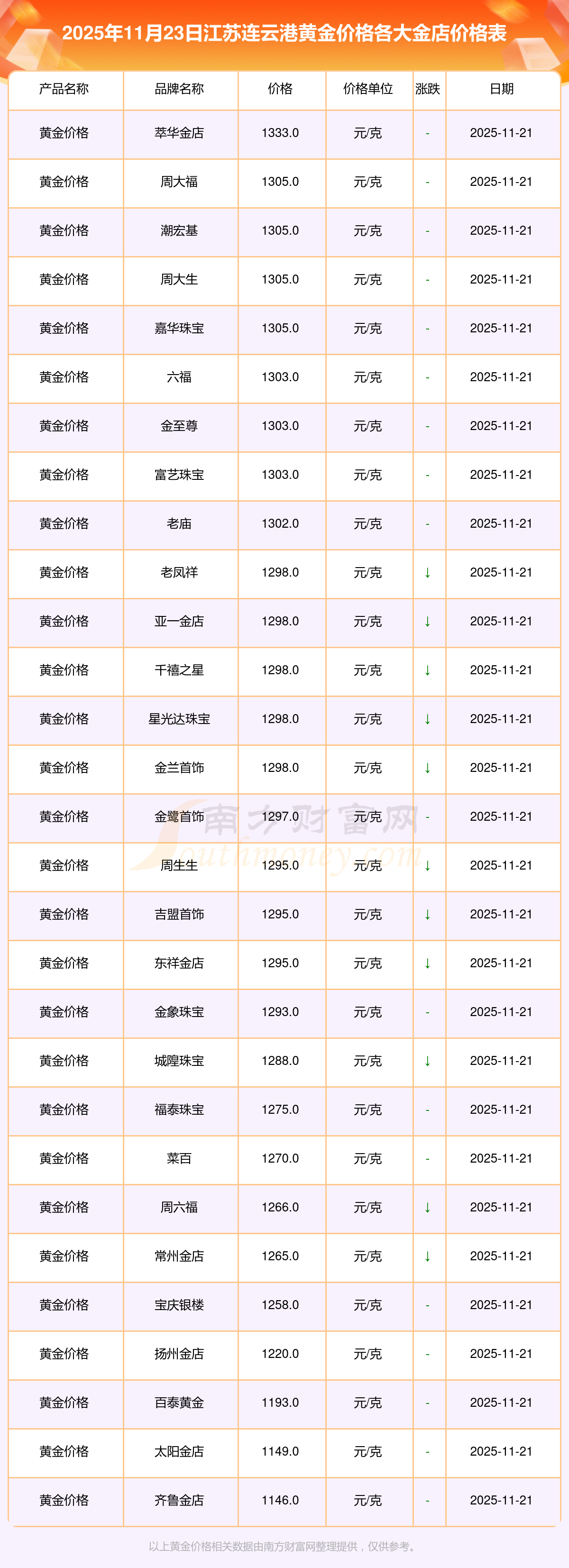 2025年11月23日江苏连云港各大金店黄金价格最新价格查询来了:周大福1305.0元/克,周大福616.0元/克,周大福1305.0元/克,周大福45110.0,周大福17570.0,周大福40690.0,周大福1143.0元/克,老凤祥1298.0元/克,老凤祥600.0元/克,老凤祥1298.0元/克,周六福1266.0元/克。