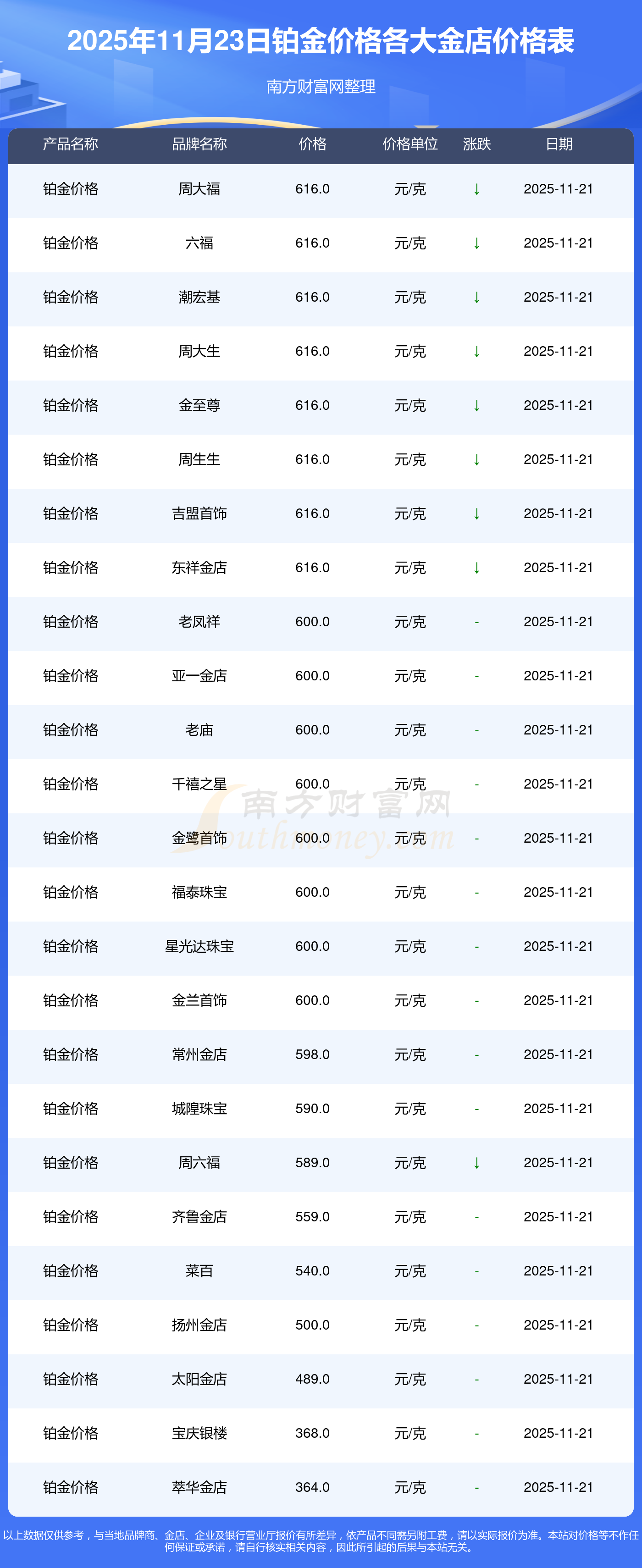 2025年11月23日各大金店铂金价格最新价格:周大福1305.0元/克,周大福616.0元/克,周大福1305.0元/克,周大福45110.0,周大福17570.0,周大福40690.0,周大福1143.0元/克,老凤祥1298.0元/克,老凤祥600.0元/克,老凤祥1298.0元/克,周六福1266.0元/克。
