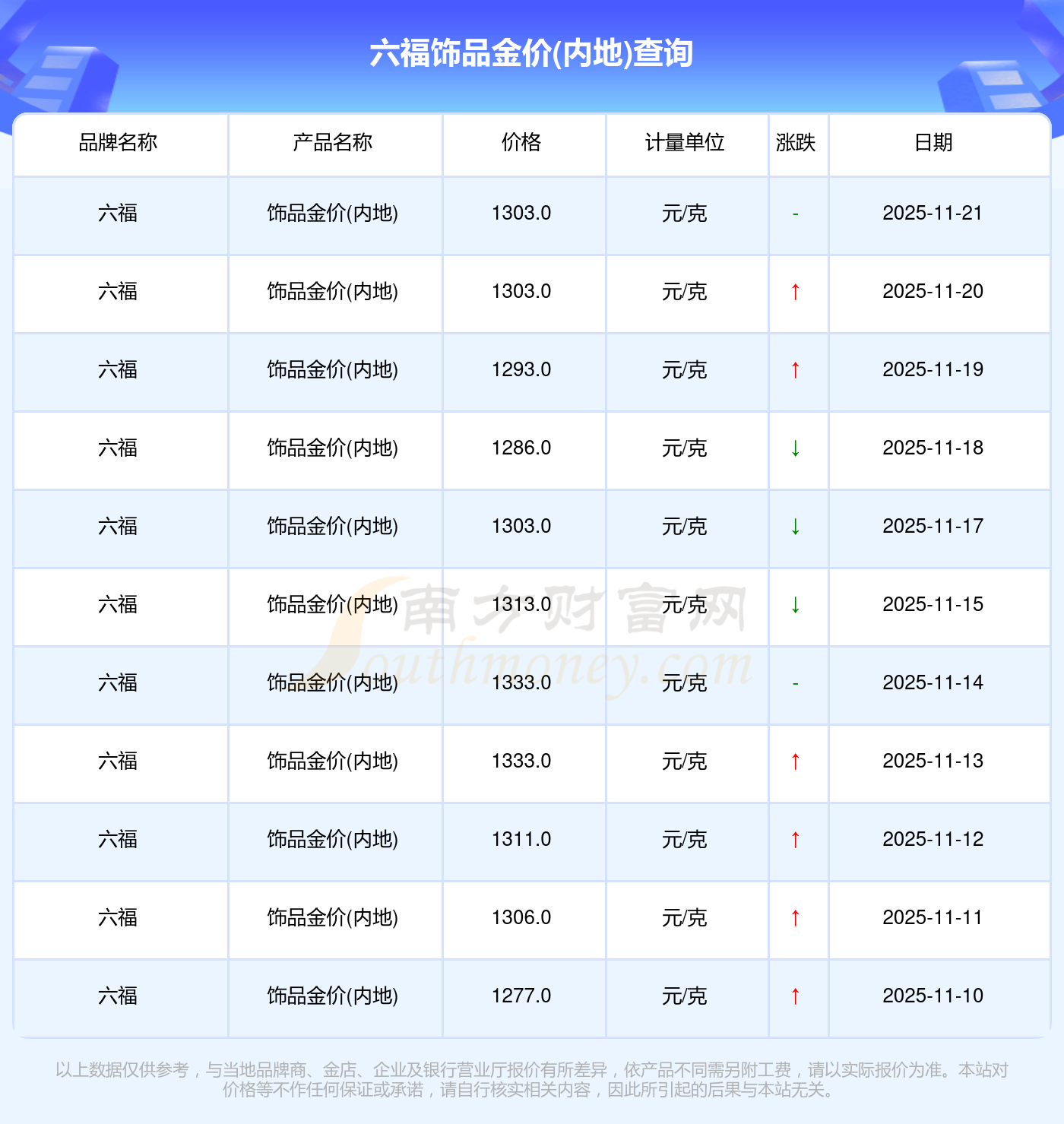 今日(2025年11月23日)六福饰品金价(内地)是1303.0元/克。
