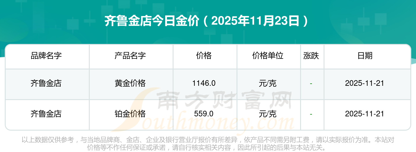 2025年11月23日齐鲁金店金价查询:黄金价格1305.0元/克,铂金价格616.0元/克,饰品金价(内地)1305.0元/克,黄金饰品(香港)45110.0,铂金价格(香港)17570.0,金条价格(香港)40690.0,金条金价(内地)1143.0元/克,黄金价格1298.0元/克,铂金价格600.0元/克,足金价格1298.0元/克,黄金价格1266.0元/克。