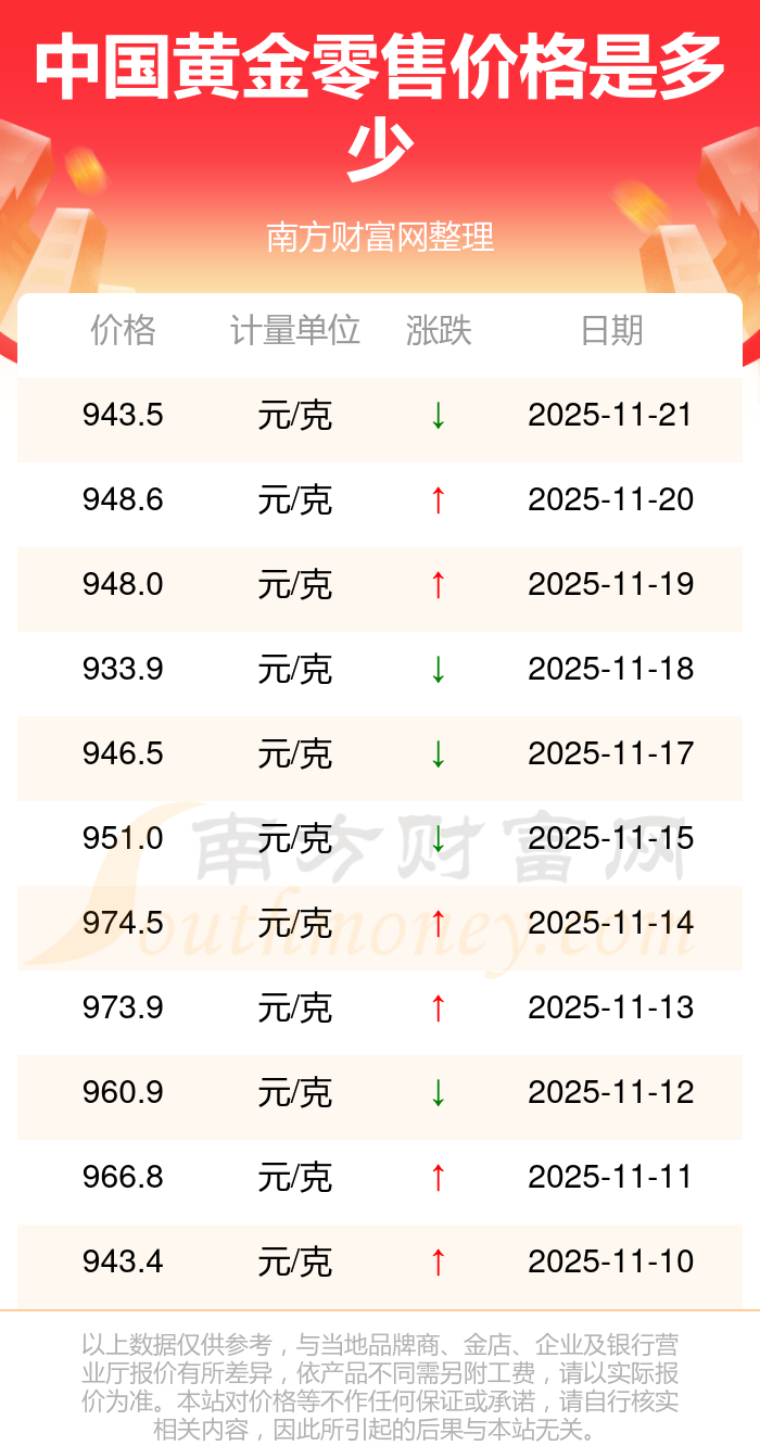 2025年11月23日中国黄金零售价格最新是943.5元/克。