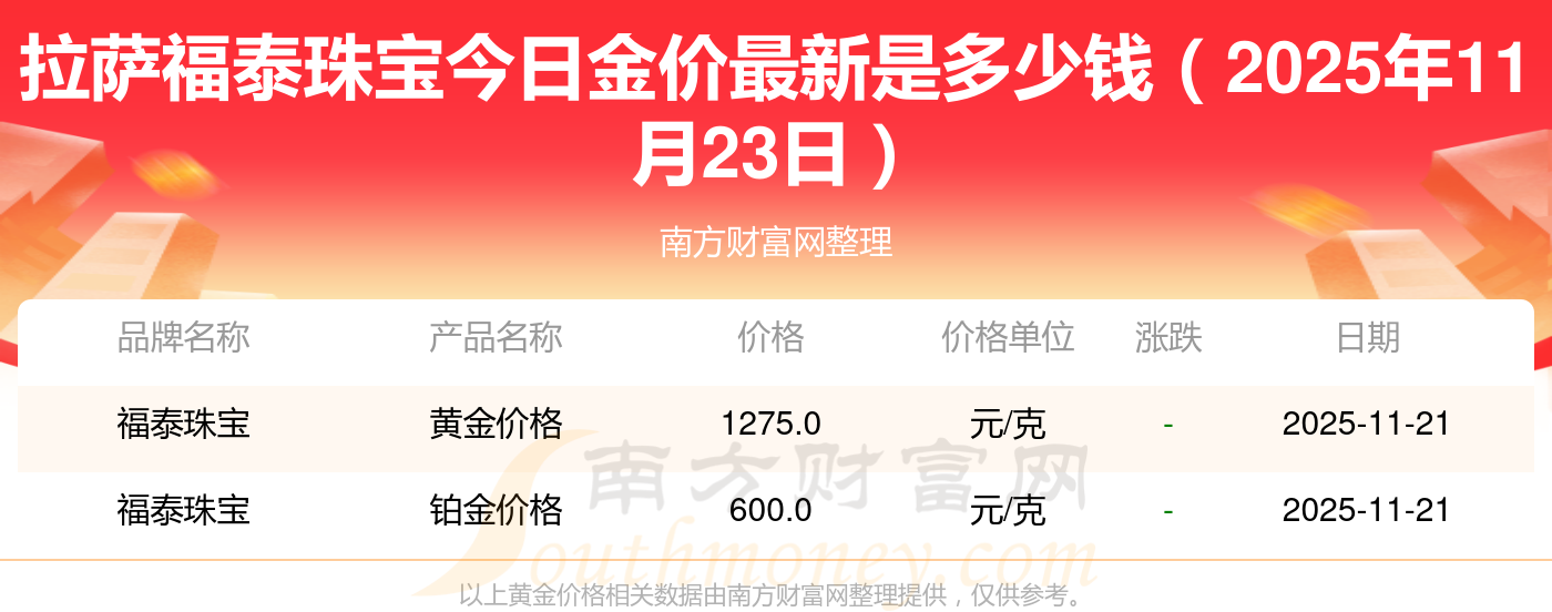 2025年11月23日拉萨福泰珠宝今日价格:黄金价格1305.0元/克,铂金价格616.0元/克,饰品金价(内地)1305.0元/克,黄金饰品(香港)45110.0,铂金价格(香港)17570.0,金条价格(香港)40690.0,金条金价(内地)1143.0元/克,黄金价格1298.0元/克,铂金价格600.0元/克,足金价格1298.0元/克,黄金价格1266.0元/克。