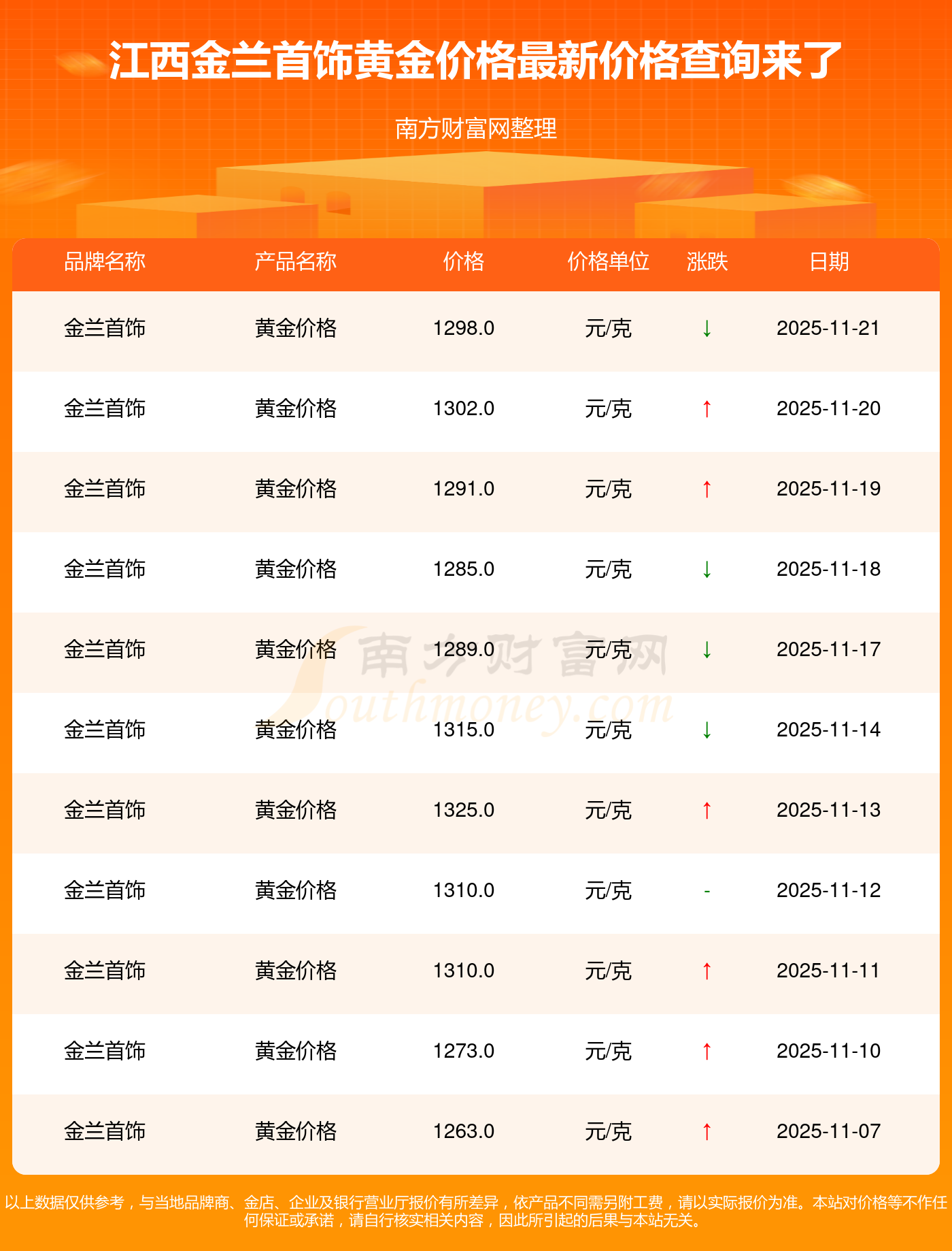 2025年11月23日,今日江西金兰首饰黄金价格:1298.0元/克。