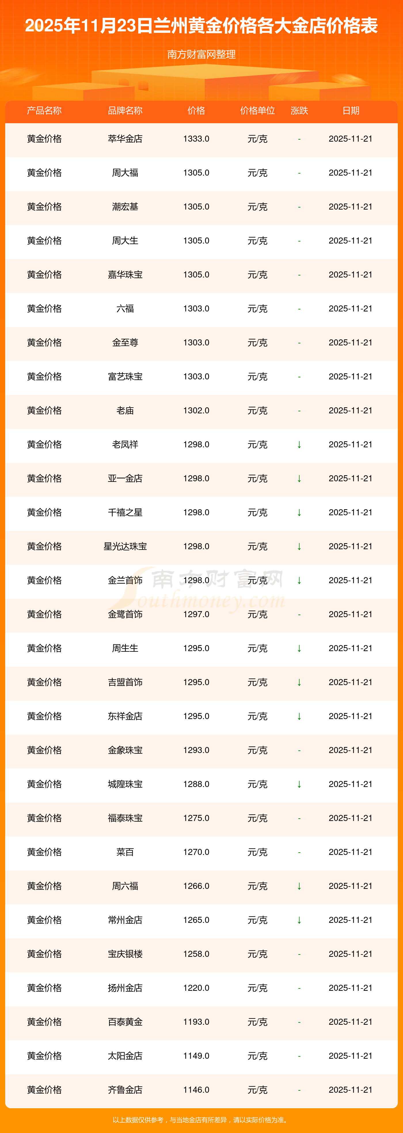 一、各大金店黄金价格查询,2025年11月23日兰州各大金店黄金价格表来了