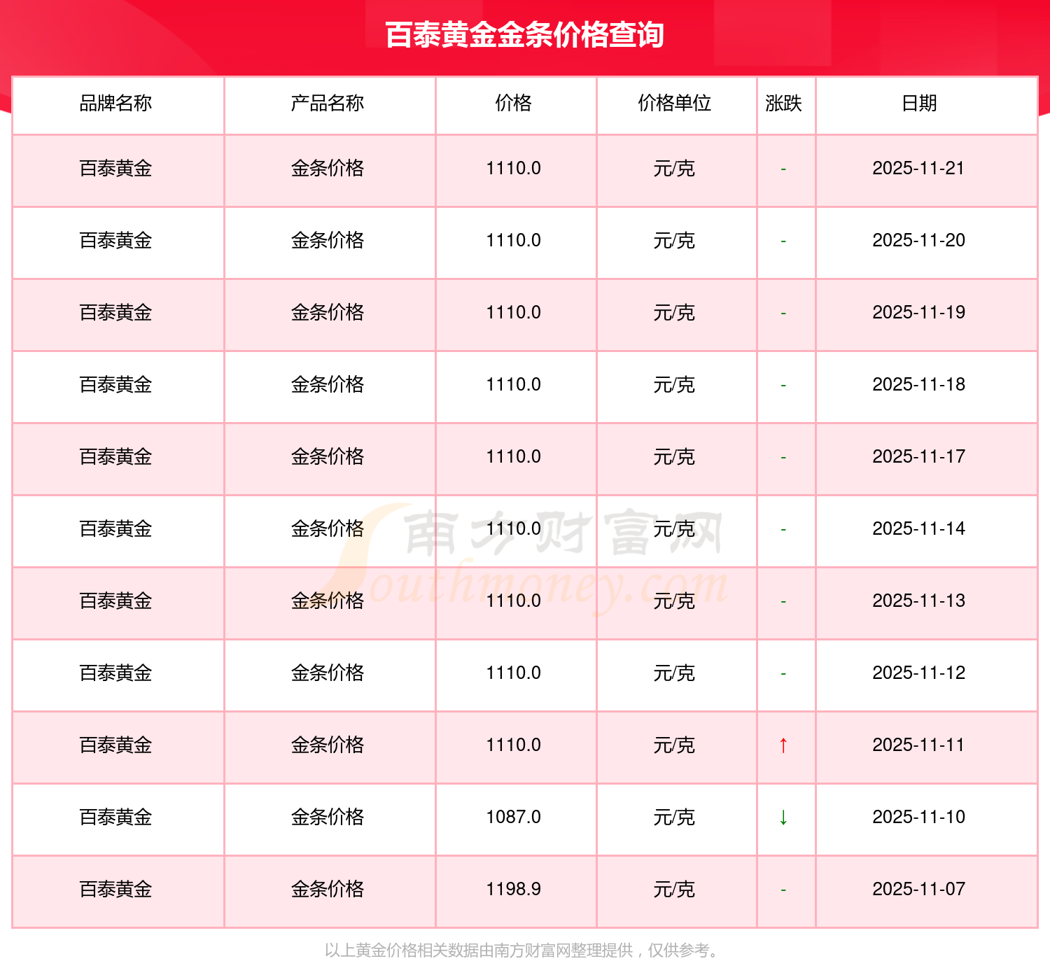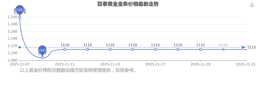 今日(2025年11月23日)百泰黄金金条价格是1110.0元/克。