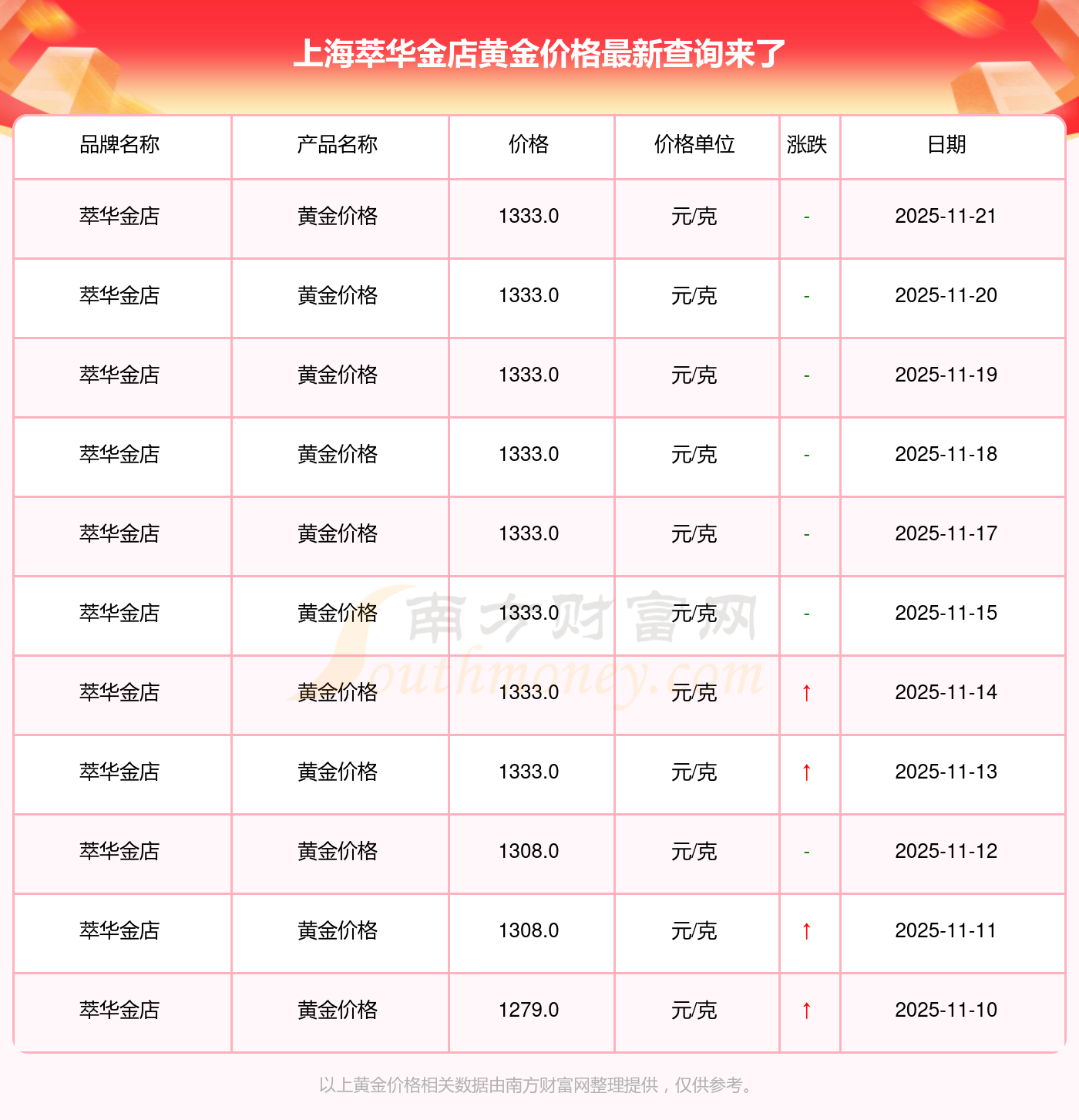 1333.0元/克的黄金价格,是上海萃华金店在 2025年11月23日给出的。