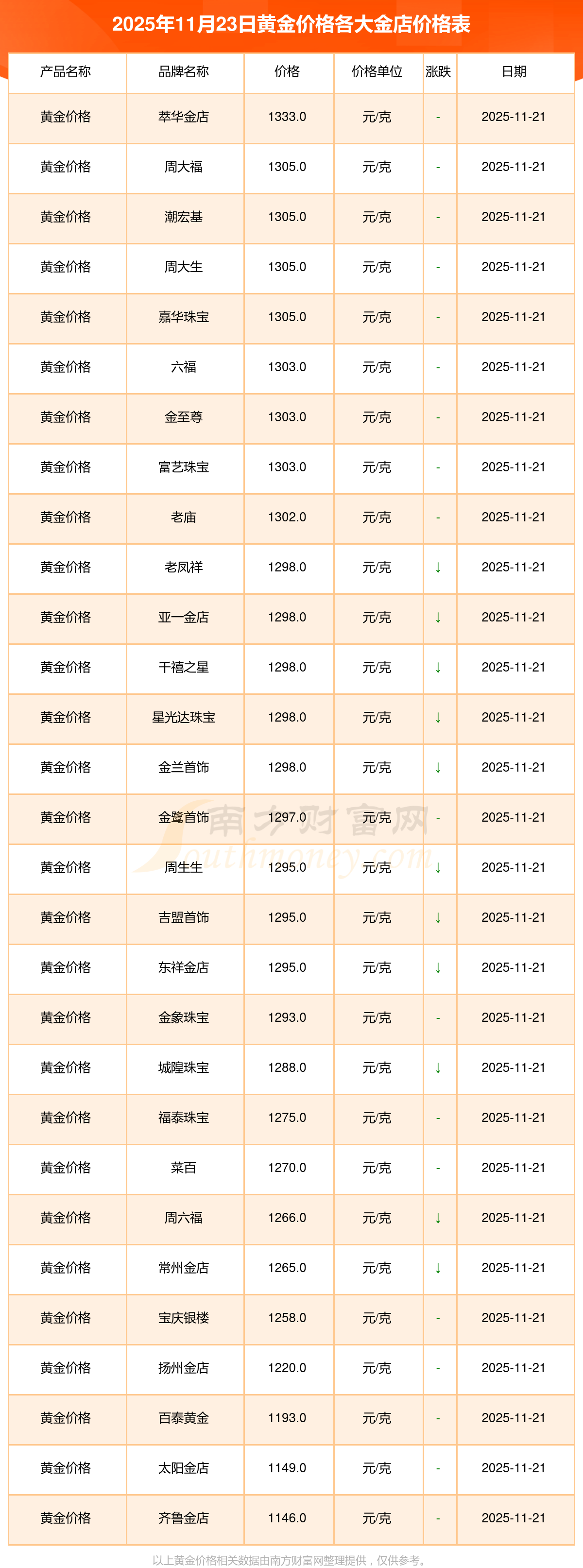 2025年11月23日各大金店黄金价格最新价格:周大福1305.0元/克,周大福616.0元/克,周大福1305.0元/克,周大福45110.0,周大福17570.0,周大福40690.0,周大福1143.0元/克,老凤祥1298.0元/克,老凤祥600.0元/克,老凤祥1298.0元/克,周六福1266.0元/克。
