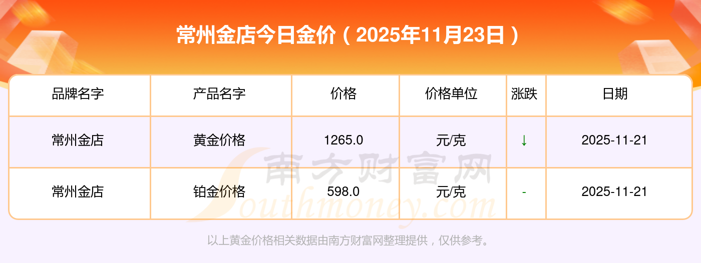 2025年11月23日各大金店黄金价格最新价格:周大福1305.0元/克,周大福616.0元/克,周大福1305.0元/克,周大福45110.0,周大福17570.0,周大福40690.0,周大福1143.0元/克,老凤祥1298.0元/克,老凤祥600.0元/克,老凤祥1298.0元/克,周六福1266.0元/克。