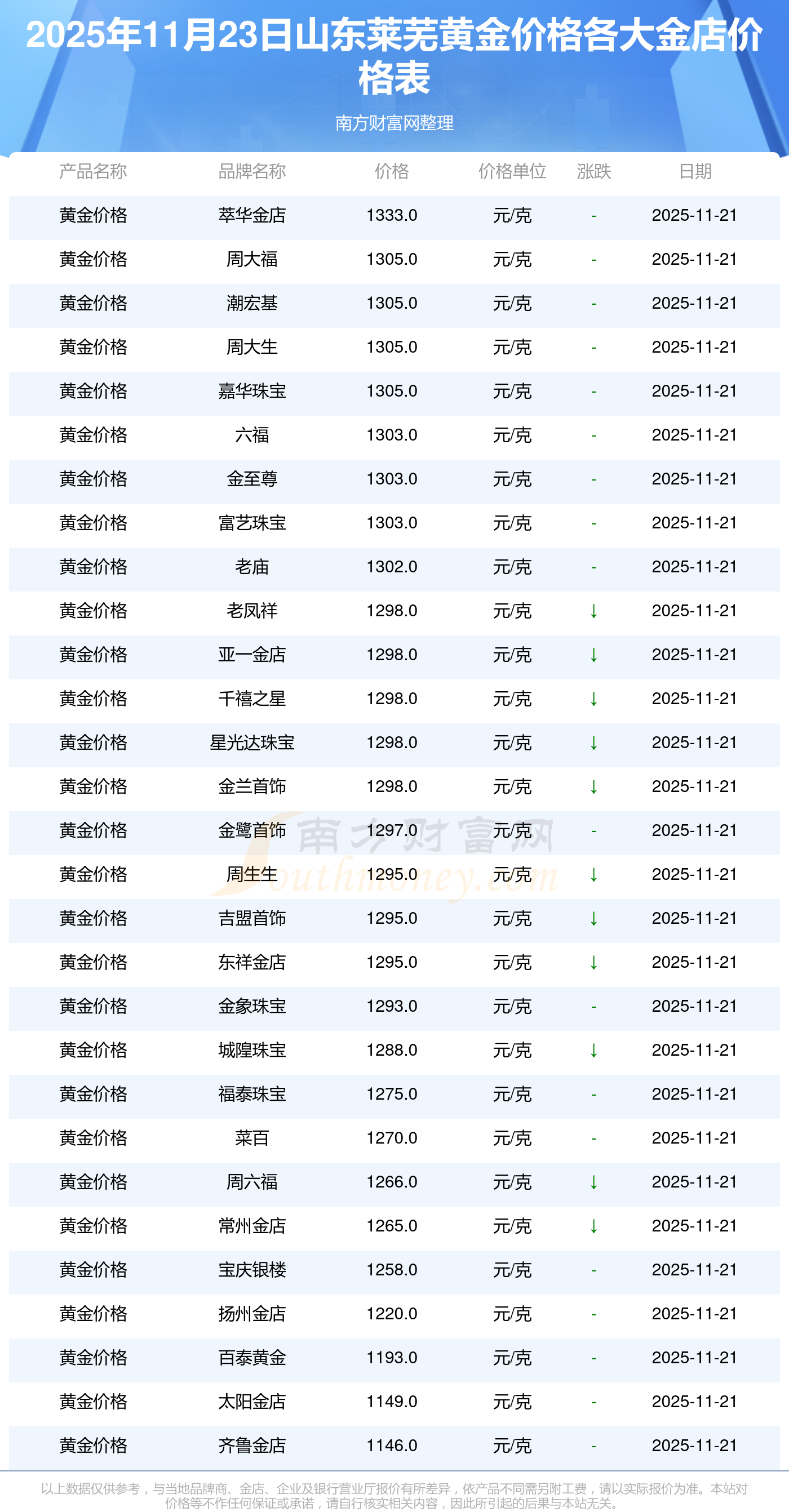 2025年11月23日山东莱芜各大金店黄金价格最新价格:周大福1305.0元/克,周大福616.0元/克,周大福1305.0元/克,周大福45110.0,周大福17570.0,周大福40690.0,周大福1143.0元/克,老凤祥1298.0元/克,老凤祥600.0元/克,老凤祥1298.0元/克,周六福1266.0元/克。