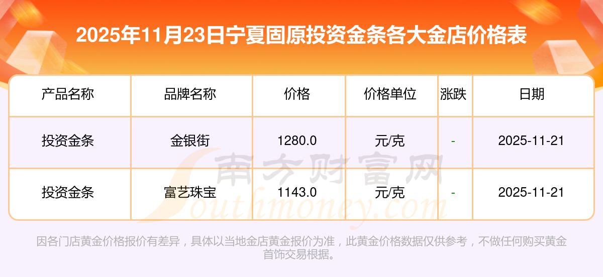 2025年11月23日宁夏固原各金店投资金条价格表一览