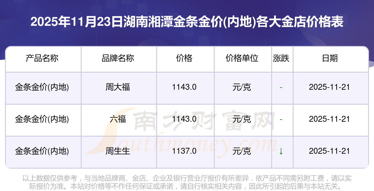 一、湖南湘潭各大品牌金店今日金条金价(内地)多少钱一克,金条金价(内地)今日价格表2025年11月23日
