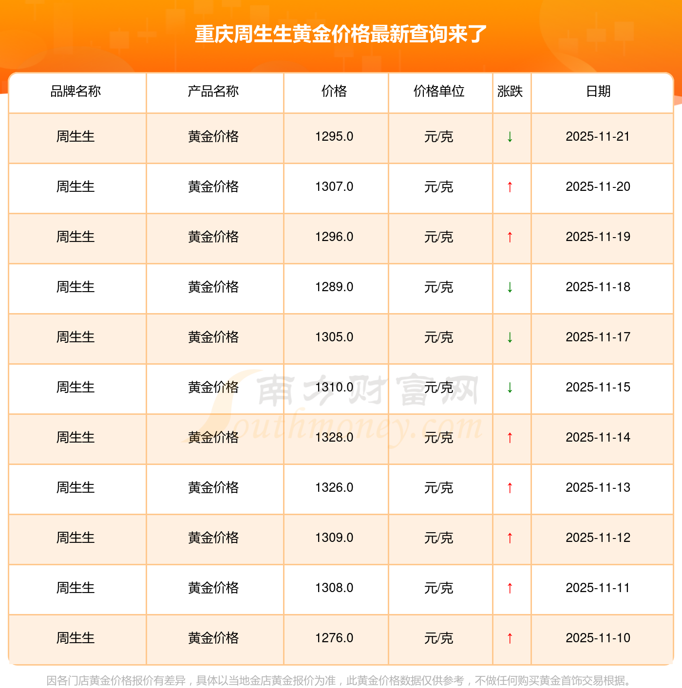 今日重庆周生生黄金价格的价格为1295.0元/克。