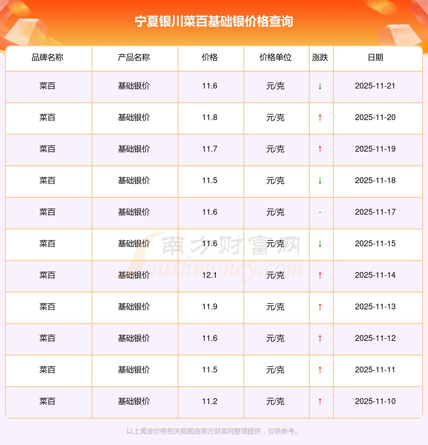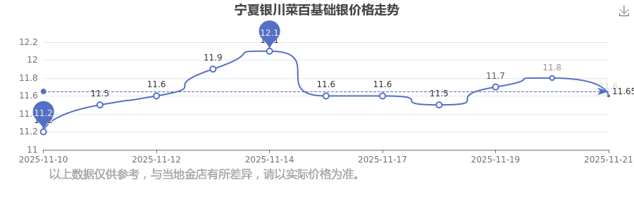 2025年11月23日宁夏银川菜百基础银价格为11.6元/克。