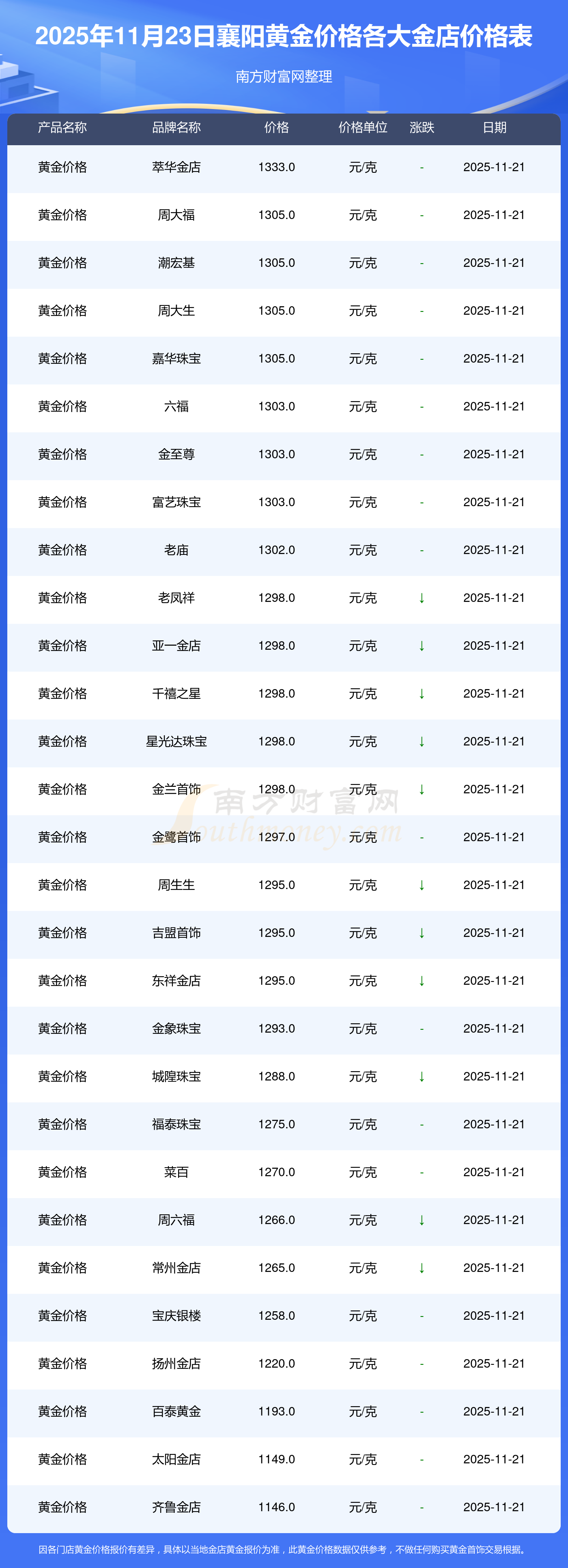 2025年11月23日襄阳各大金店黄金价格最新价格:周大福1305.0元/克,周大福616.0元/克,周大福1305.0元/克,周大福45110.0,周大福17570.0,周大福40690.0,周大福1143.0元/克,老凤祥1298.0元/克,老凤祥600.0元/克,老凤祥1298.0元/克,周六福1266.0元/克。