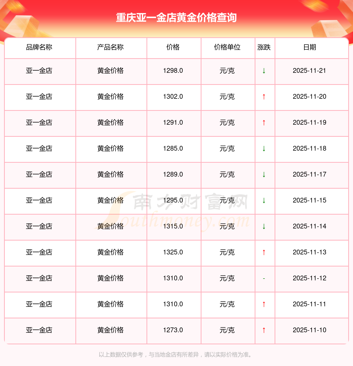 重庆亚一金店今日黄金价格最新公布(当下购买一克黄金的价格是多少)?今日重庆亚一金店黄金价格查询,重庆亚一金店在 2025年11月23日,黄金价格的售卖价格是 1298.0元/克。