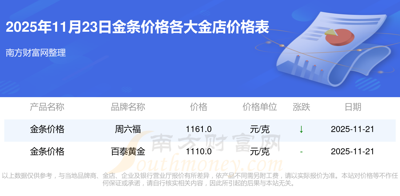 今天是2025年11月23日,周大福、周大福、周大福、周大福、周大福、周大福、周大福、老凤祥、老凤祥、老凤祥、周六福等各大金店品牌金条价格最新价格如下:周大福1305.0元/克、周大福616.0元/克、周大福1305.0元/克、周大福45110.0、周大福17570.0、周大福40690.0、周大福1143.0元/克、老凤祥1298.0元/克、老凤祥600.0元/克、老凤祥1298.0元/克、周六福1266.0元/克。