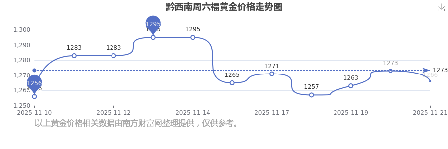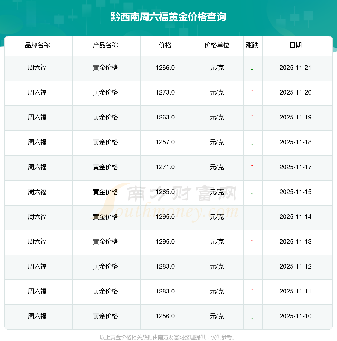 黔西南周六福 2025年11月23日的黄金价格价位为 1266.0元/克。
