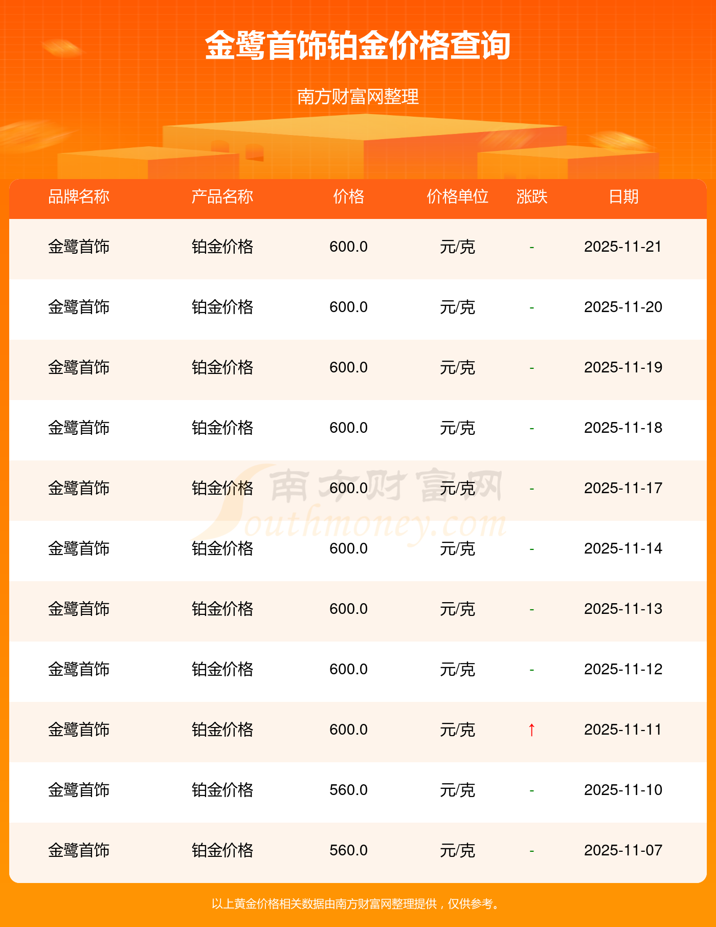当下,金鹭首饰 铂金价格今日的最新价格是600.0元/克。