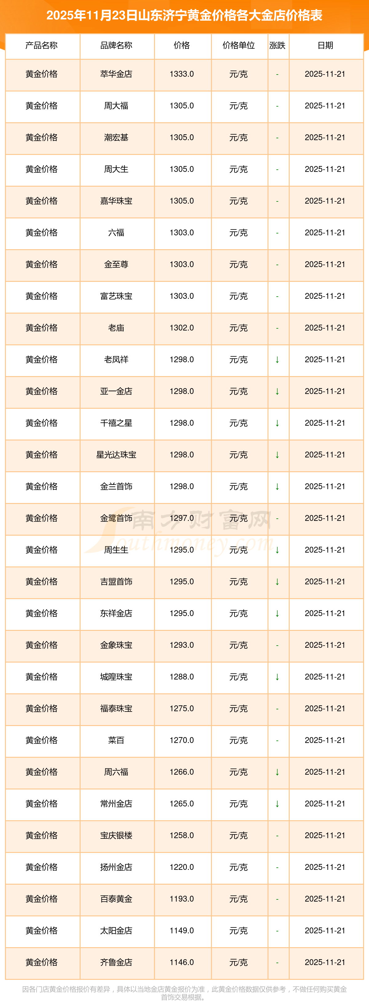目前,山东济宁黄金价格报价区间在1333.0元/克和1146.0元/克之间。最高的为萃华金店,报价1333.0元/克,最低的为齐鲁金店,报价1146.0元/克。今日黄金价格高低差为187元/克。