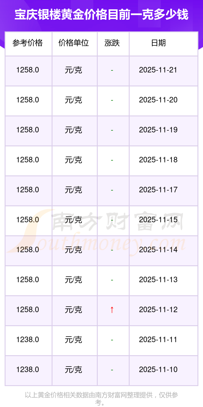 今日(2025年11月23日),宝庆银楼黄金价格最新价格是1258.0元/克。