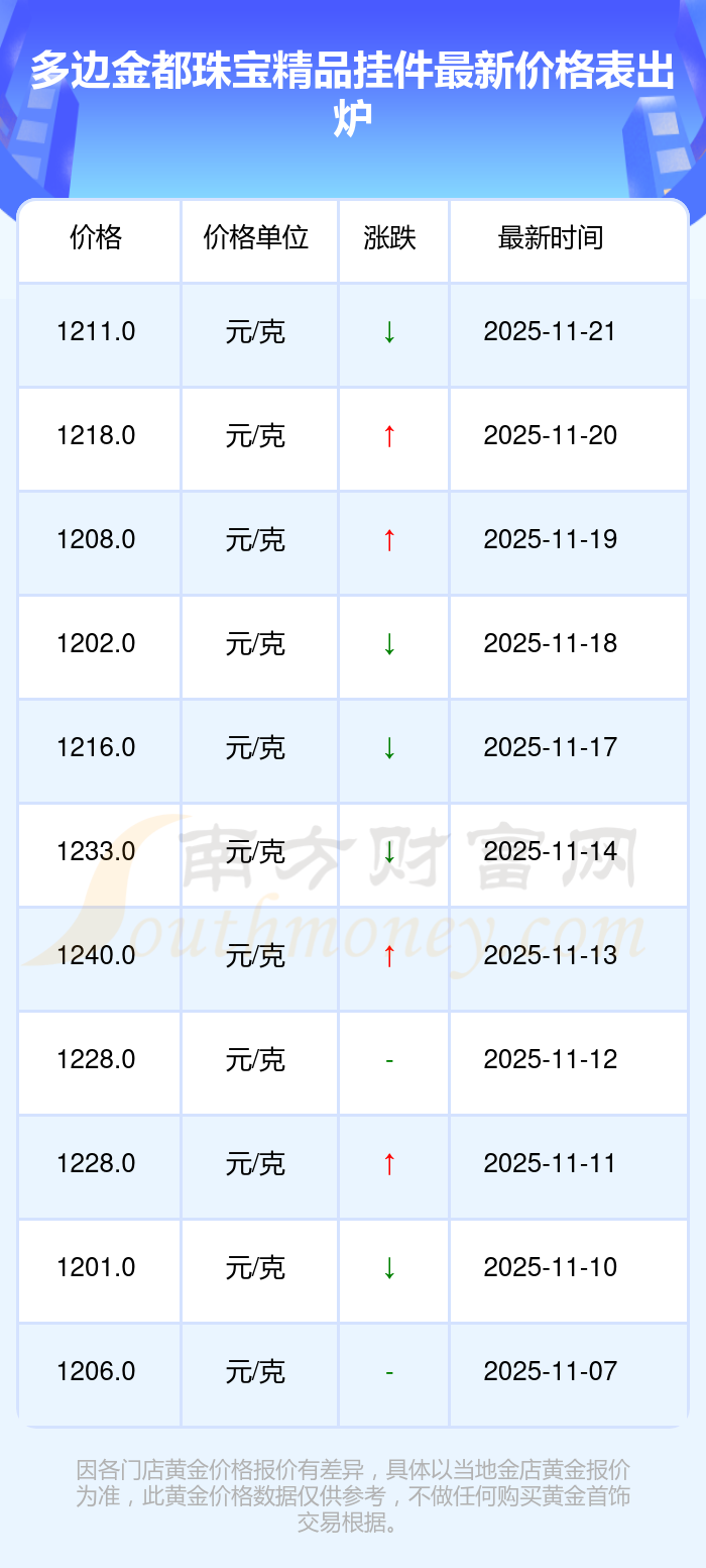 多边金都珠宝 精品挂件在今日的最新价格显示为1211.0元/克。