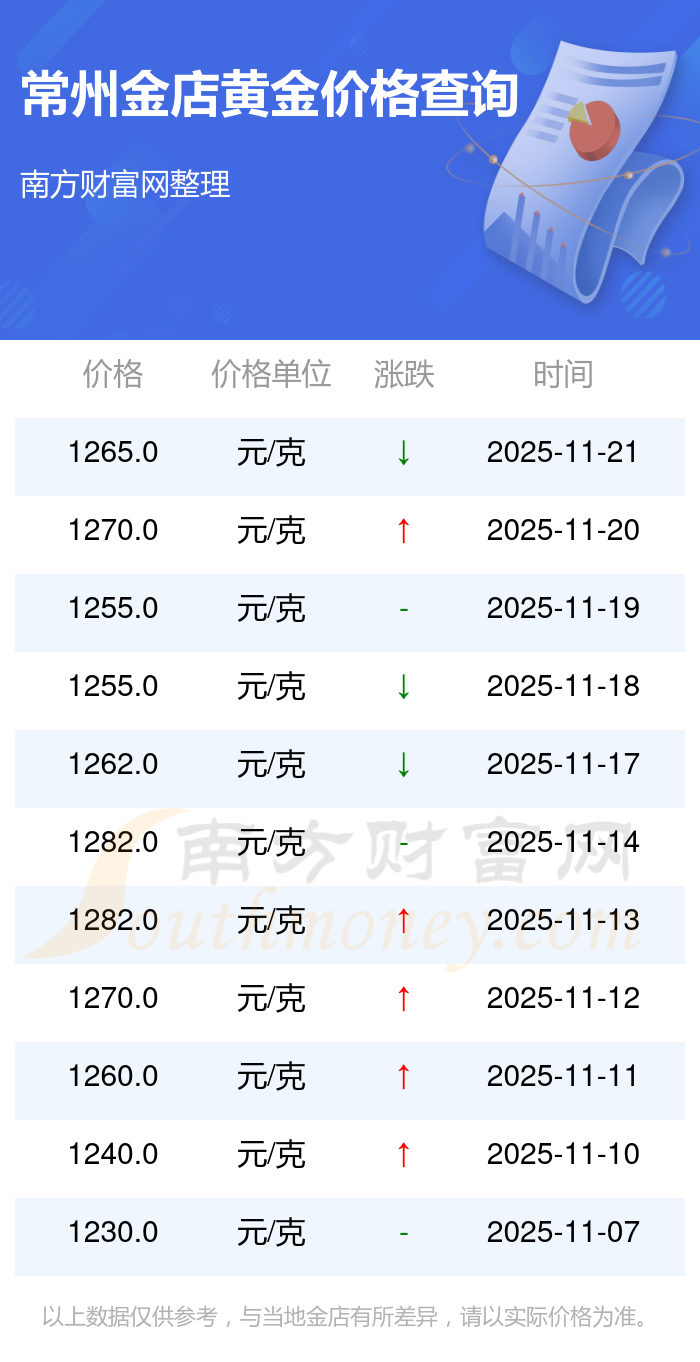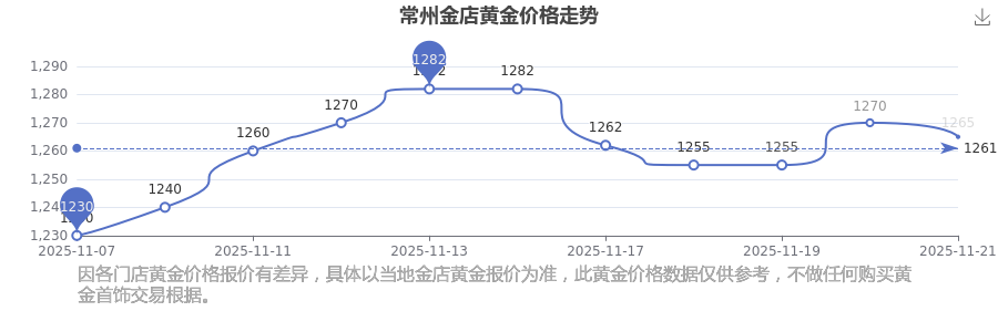 想查询今天黄金价格,此刻黄金一克的价格是多少呀?黄金是种优良的导电导热材料,具有良好的导热特性。因其化学稳定性高、抗氧化性强,能够制作高精度电子元件,故而常用于电子工业中的特殊电路设计。今日常州金店黄金价格最新查询:1265.0元/克。