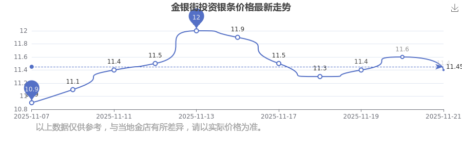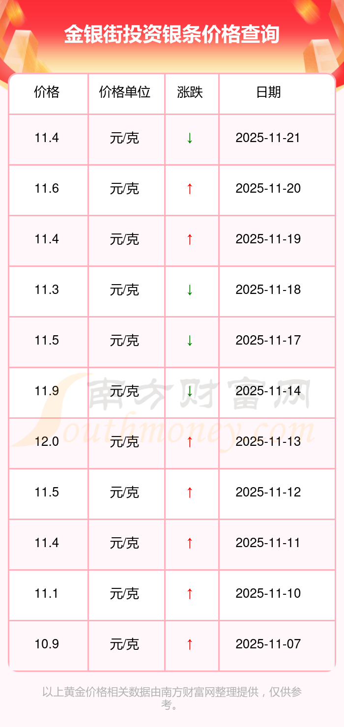 2025年11月23日金银街投资银条价格:11.4元/克。
