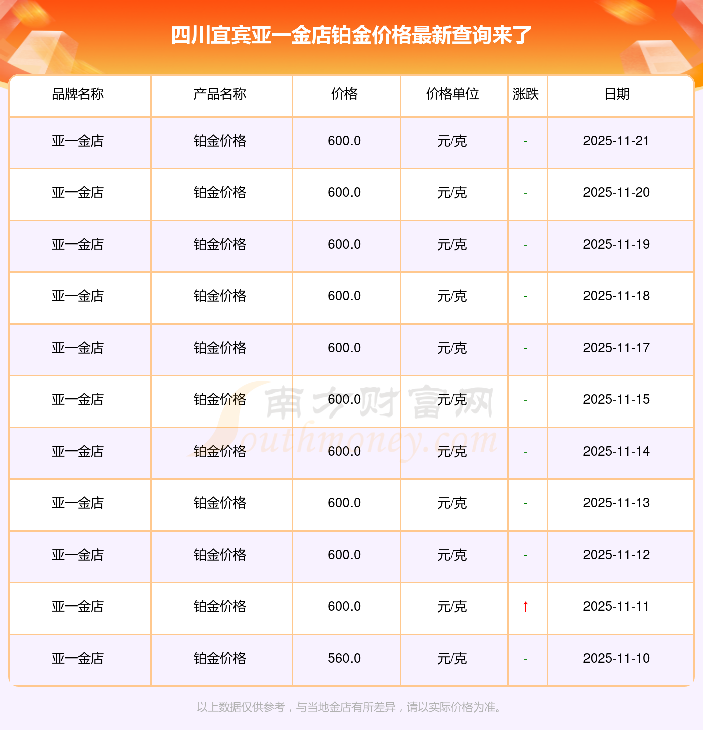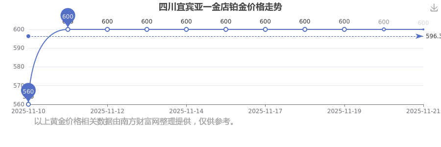 2025年11月23日,四川宜宾亚一金店的铂金价格标价达到 600.0元/克。
