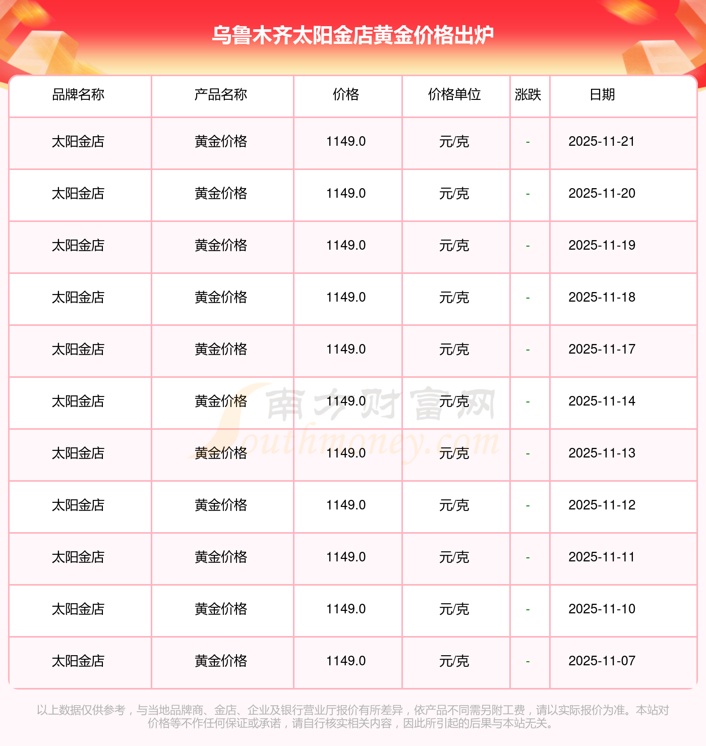 乌鲁木齐太阳金店在 2025年11月23日的黄金价格零售价格为 1149.0元/克。