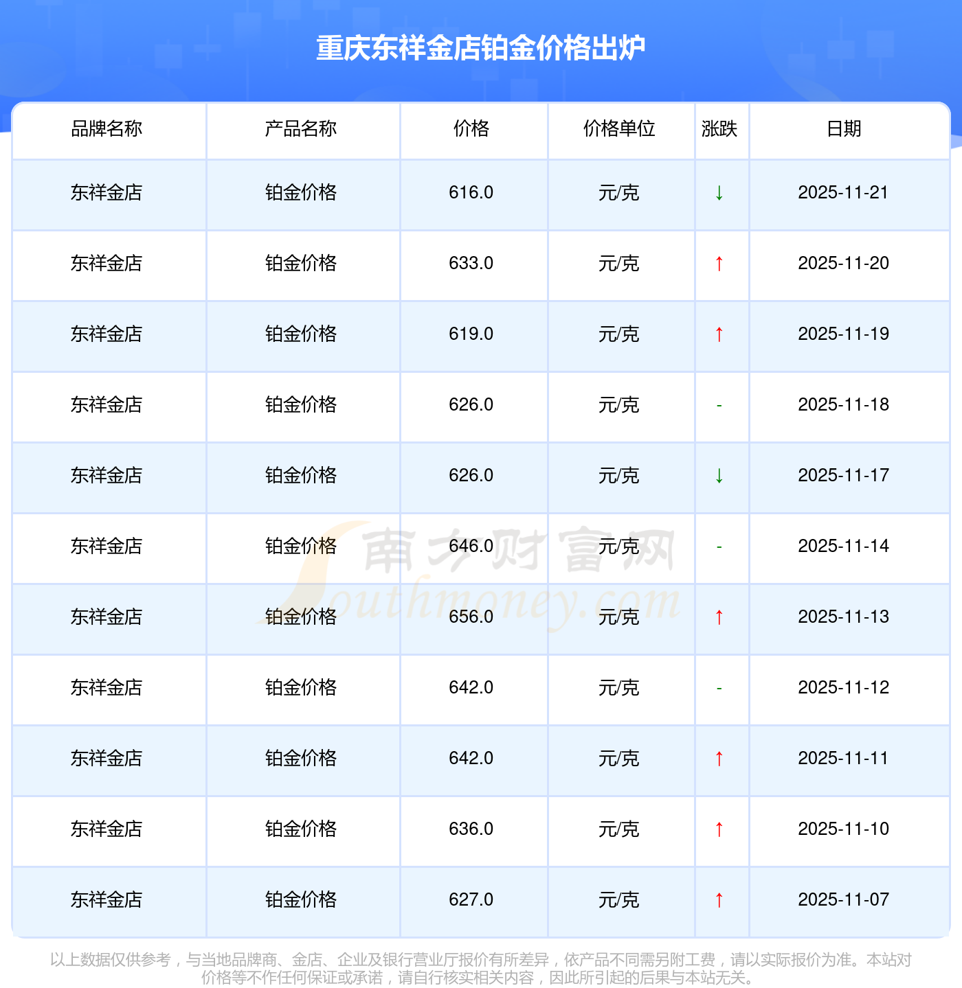 2025年11月23日,重庆东祥金店铂金价格每克的价值量定格在616.0元/克。