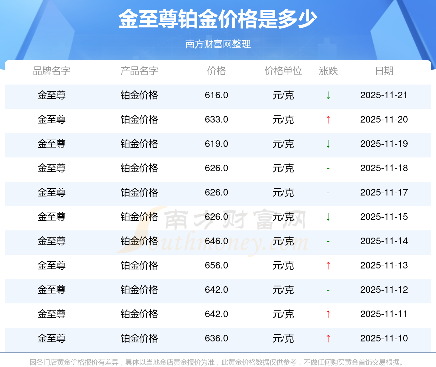 今日(2025年11月23日)金至尊铂金价格为616.0元/克。