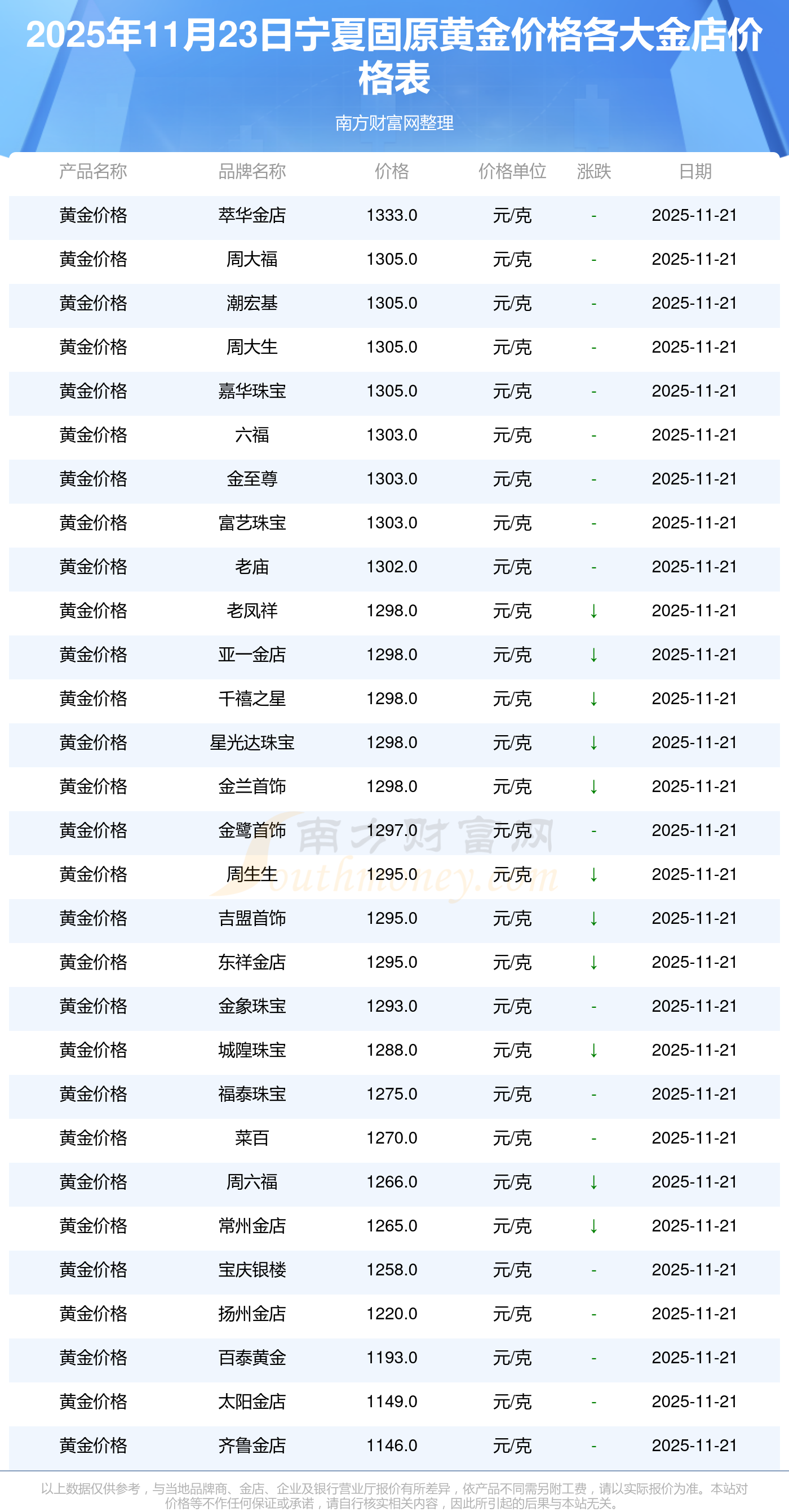 2025年11月23日,宁夏固原周大福、周大福、周大福、周大福、周大福、周大福、周大福、老凤祥、老凤祥、老凤祥、周六福等各大金店品牌黄金价格今日价格行情最新来了:周大福1305.0元/克、周大福616.0元/克、周大福1305.0元/克、周大福45110.0、周大福17570.0、周大福40690.0、周大福1143.0元/克、老凤祥1298.0元/克、老凤祥600.0元/克、老凤祥1298.0元/克、周六福1266.0元/克。