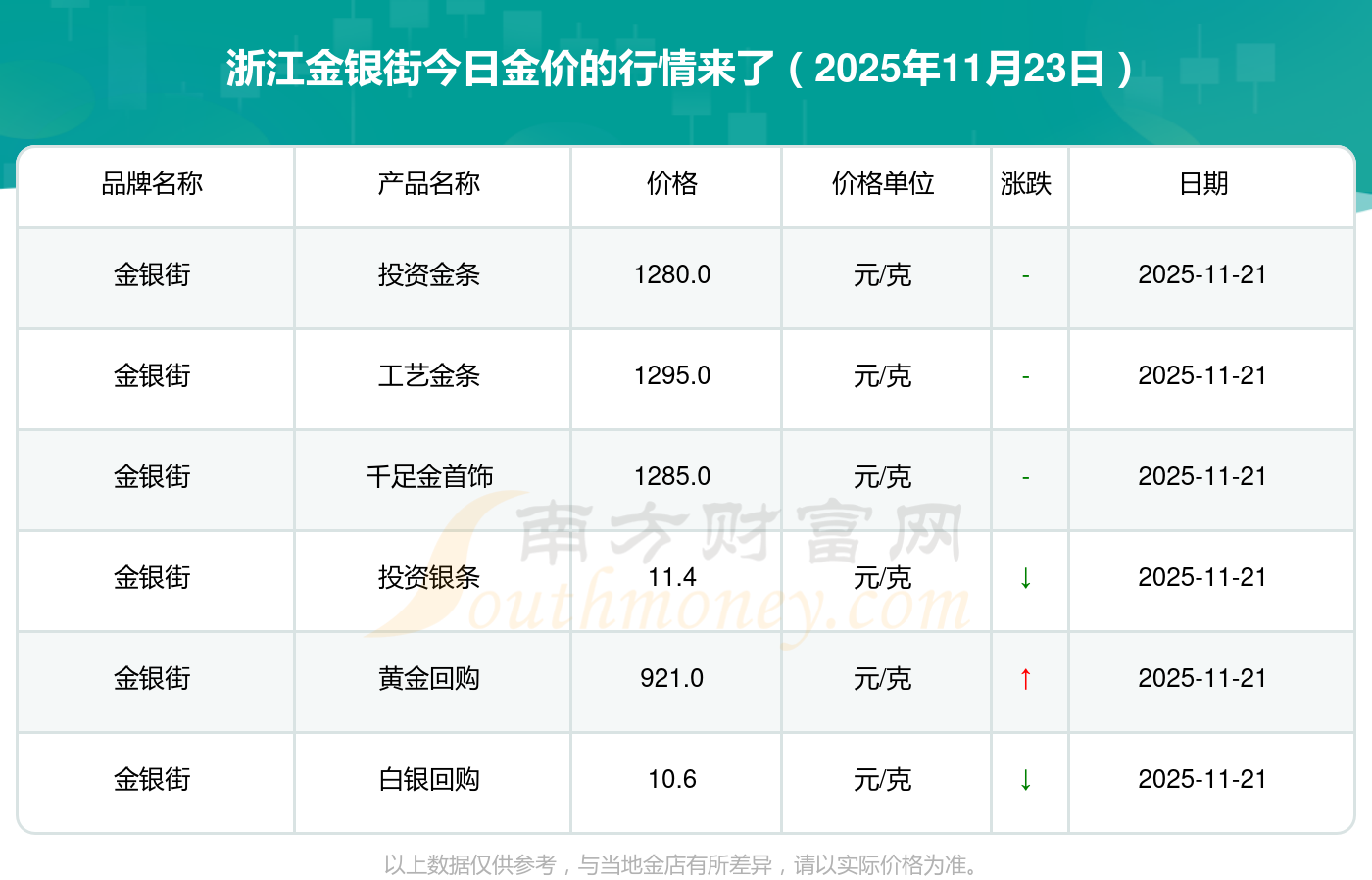 2025年11月23日浙江金银街一克黄金对应的价格是多少?黄金价格1305.0元/克,铂金价格616.0元/克,饰品金价(内地)1305.0元/克,黄金饰品(香港)45110.0,铂金价格(香港)17570.0,金条价格(香港)40690.0,金条金价(内地)1143.0元/克,黄金价格1298.0元/克,铂金价格600.0元/克,足金价格1298.0元/克,黄金价格1266.0元/克。